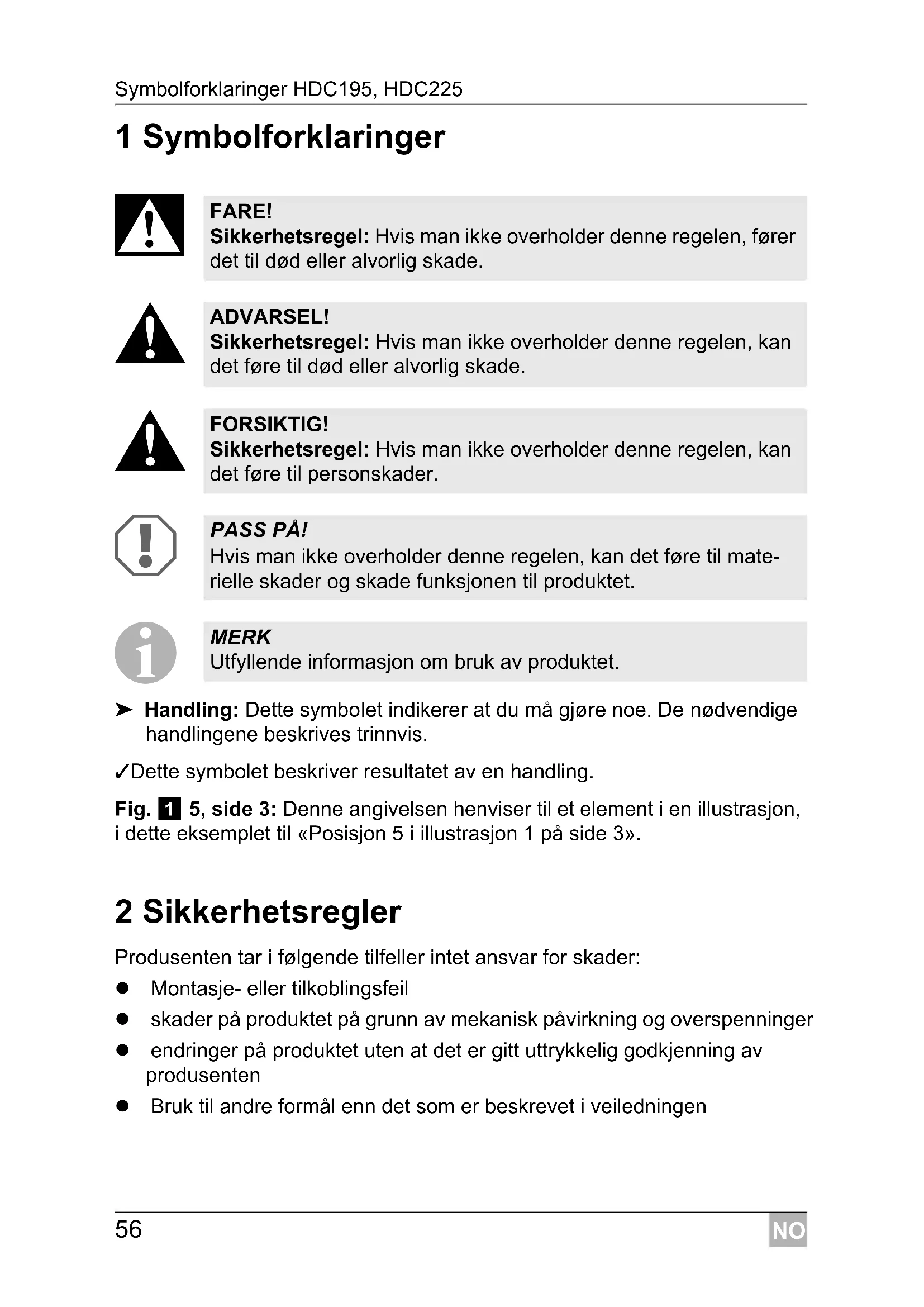 ➤ Handling: Dette symbolet indikerer at du må gjøre noe. De nødvendige handlingene beskrives trinnvis. ✓ Dette symbolet beskriver resultatet av en handling. Fig. 1 5, side 3: Denne angivelsen henviser til et element i en illustrasjon, i dette eksemplet til «Posisjon 5 i illustrasjon 1 på side 3». 2 Sikkerhetsregler Produsenten tar i følgende tilfeller intet ansvar for skader: Montasje- eller tilkoblingsfeil skader på produktet på grunn av mekanisk påvirkning og overspenninger endringer på produktet uten at det er gitt uttrykkelig godkjenning av produsenten Bruk til andre formål enn det som er beskrevet i veiledningen FARE! Sikkerhetsregel: Hvis man ikke overholder denne regelen, fører det til død eller alvorlig skade. ADVARSEL! Sikkerhetsregel: Hvis man ikke overholder denne regelen, kan det føre til død eller alvorlig skade. FORSIKTIG! Sikkerhetsregel: Hvis man ikke overholder denne regelen, kan det føre til personskader. PASS PÅ! Hvis man ikke overholder denne regelen, kan det føre til mate- rielle skader og skade funksjonen til produktet. MERK Utfyllende informasjon om bruk av produktet.NO HDC195, HDC225 Sikkerhetsregler