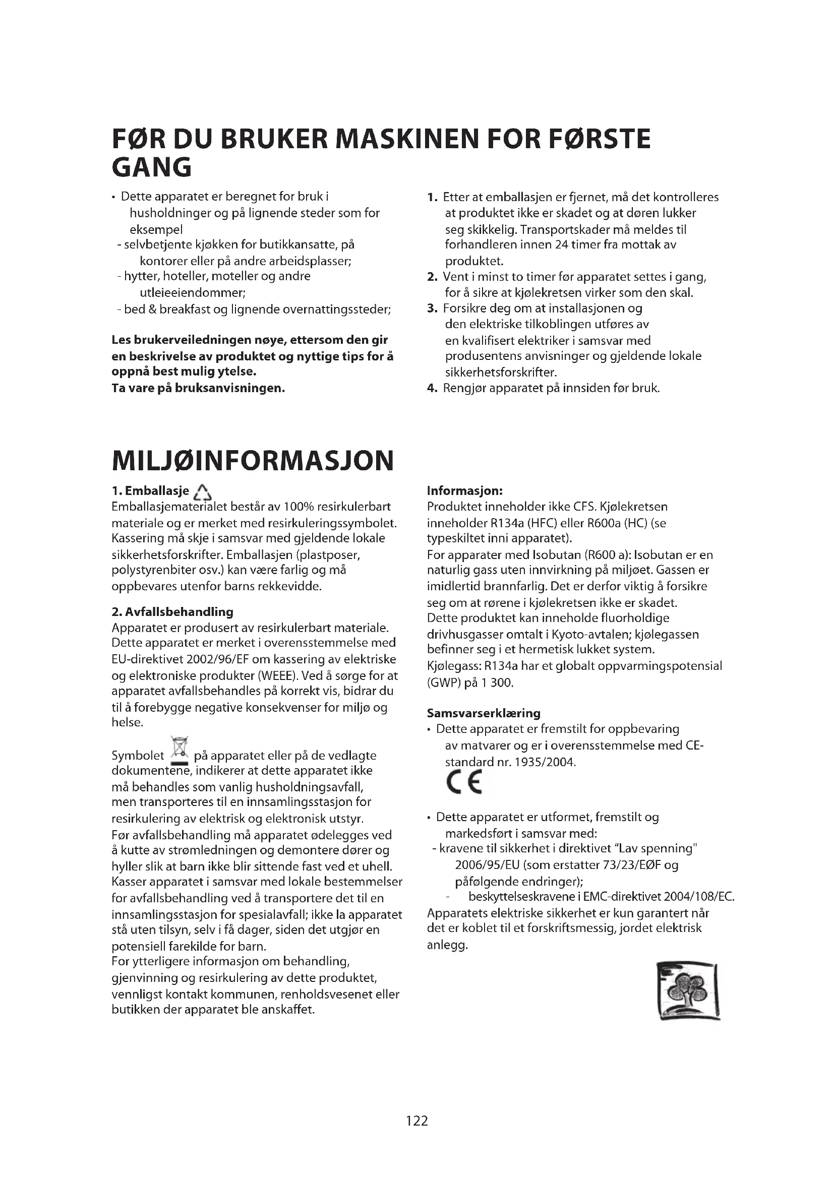 Apparatet er produsert av resirkulerbart materiale. Dette apparatet er merket i overensstemmelse med EU-direktivet 2002/96/EF om kassering av elektriske og elektroniske produkter (WEEE). Ved å sørge for at apparatet avfallsbehandles på korrekt vis, bidrar du til å forebygge negative konsekvenser for miljø og helse. Symbolet på apparatet eller på de vedlagte dokumentene, indikerer at dette apparatet ikke må behandles som vanlig husholdningsavfall, men transporteres til en innsamlingsstasjon for resirkulering av elektrisk og elektronisk utstyr. Før avfallsbehandling må apparatet ødelegges ved å kutte av strømledningen og demontere dører og hyller slik at barn ikke blir sittende fast ved et uhell. Kasser apparatet i samsvar med lokale bestemmelser for avfallsbehandling ved å transportere det til en innsamlingsstasjon for spesialavfall; ikke la apparatet stå uten tilsyn, selv i få dager, siden det utgjør en potensiell farekilde for barn. For ytterligere informasjon om behandling, gjenvinning og resirkulering av dette produktet, vennligst kontakt kommunen, renholdsvesenet eller butikken der apparatet ble anskaffet. Informasjon: Produktet inneholder ikke CFS. Kjølekretsen inneholder R134a (HFC) eller R600a (HC) (se typeskiltet inni apparatet). For apparater med Isobutan (R600 a): Isobutan er en naturlig gass uten innvirkning på miljøet. Gassen er imidlertid brannfarlig. Det er derfor viktig å forsikre seg om at rørene i kjølekretsen ikke er skadet. Dette produktet kan inneholde fluorholdige drivhusgasser omtalt i Kyoto-avtalen; kjølegassen befinner seg i et hermetisk lukket system. Kjølegass: R134a har et globalt oppvarmingspotensial (GWP) på 1 300. Samsvarserklæring