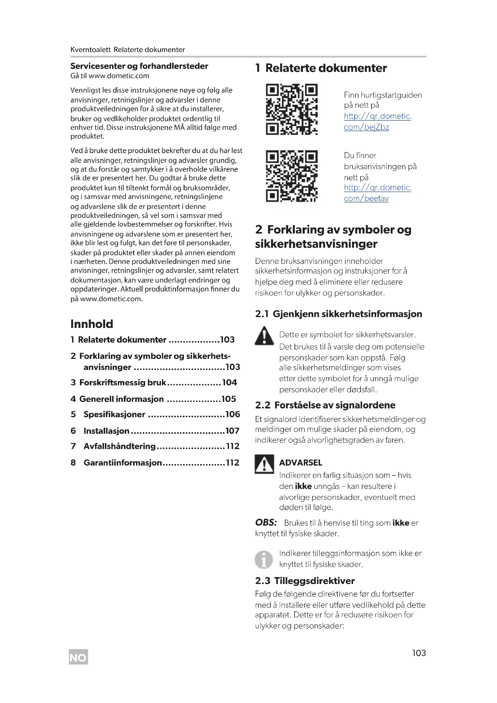 - 8 Garantiinformasjon 1 Relaterte dokumenter Finn hurtigstartguiden på nett på http://qr.dometic. com/bejZbz Du finner bruksanvisningen på nett på http://qr.dometic. com/beetav 2 Forklaring av symboler og sikkerhetsanvisninger Denne bruksanvisningen inneholder sikkerhetsinformasjon og instruksjoner for å hjelpe deg med å eliminere eller redusere risikoen for ulykker og personskader. p. 112