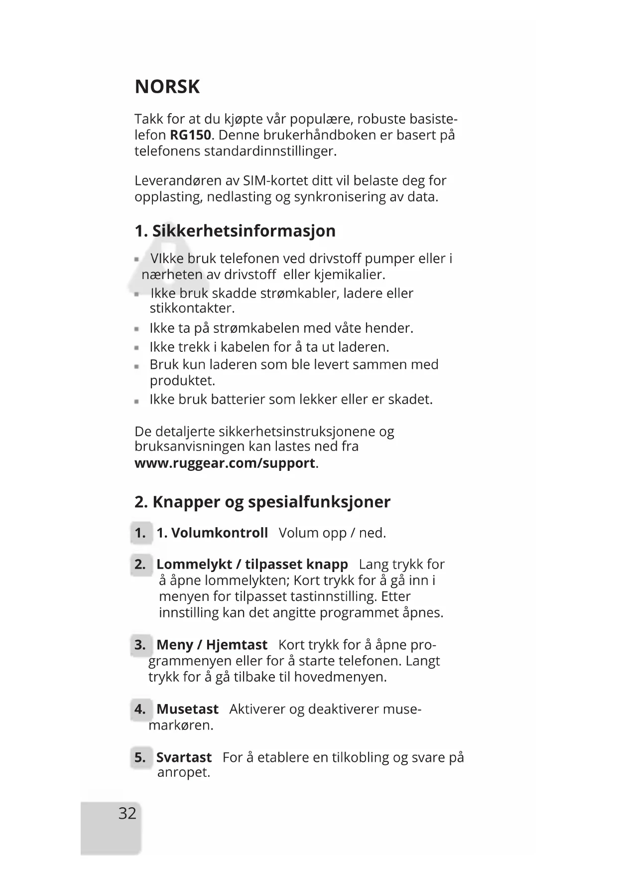 De detaljerte sikkerhetsinstruksjonene og bruksanvisningen kan lastes ned fra www.ruggear.com/support.