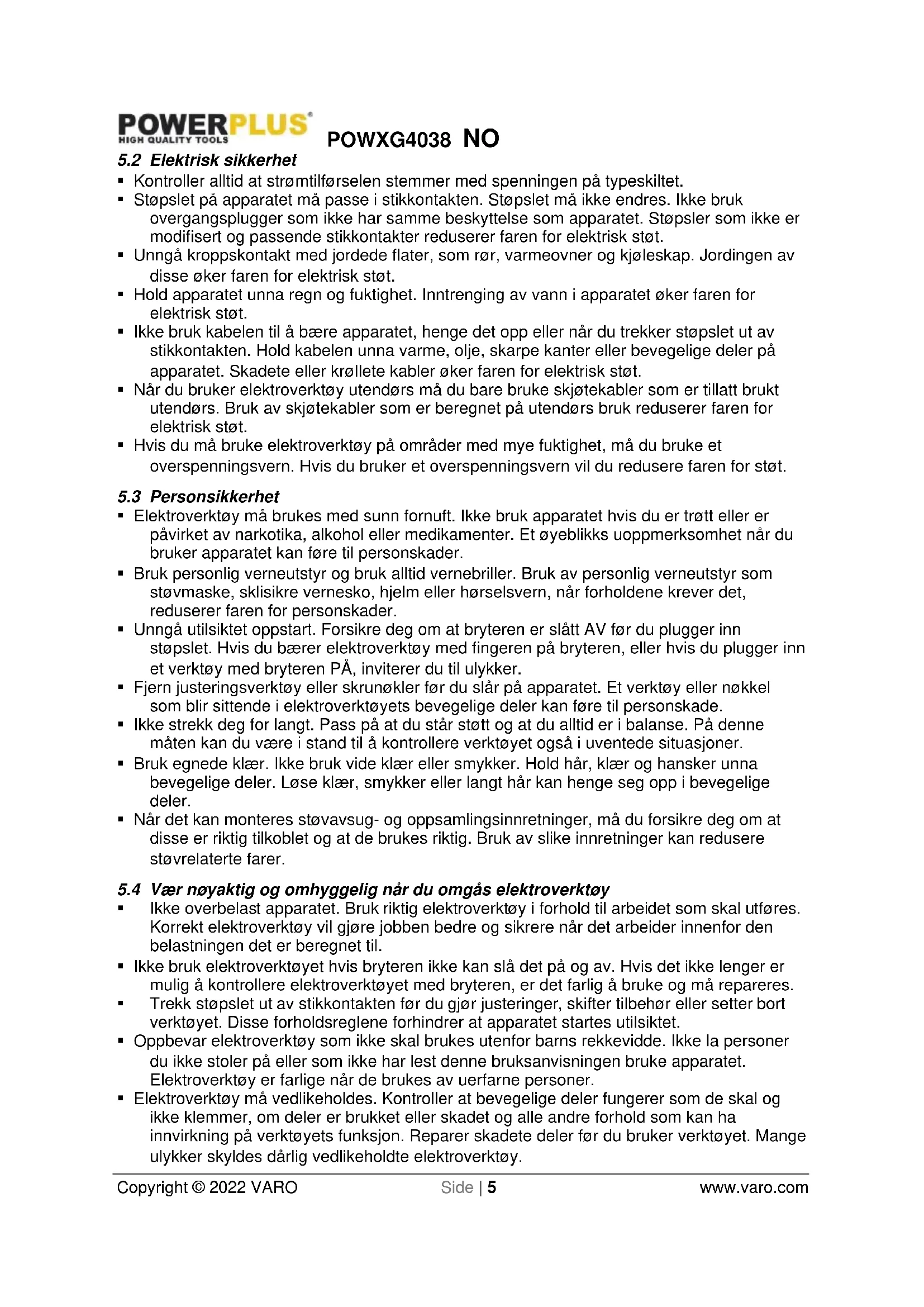 - Elektroverktøy må vedlikeholdes. Kontroller at bevegelige deler fungerer som de skal og ikke klemmer, om deler er brukket eller skadet og alle andre forhold som kan ha innvirkning på verktøyets funksjon. Reparer skadete deler før du bruker verktøyet. Mange ulykker skyldes dårlig vedlikeholdte elektroverktøy.POWXG4038 NO Copyright © 2022 VARO Side | 6 www.varo.com