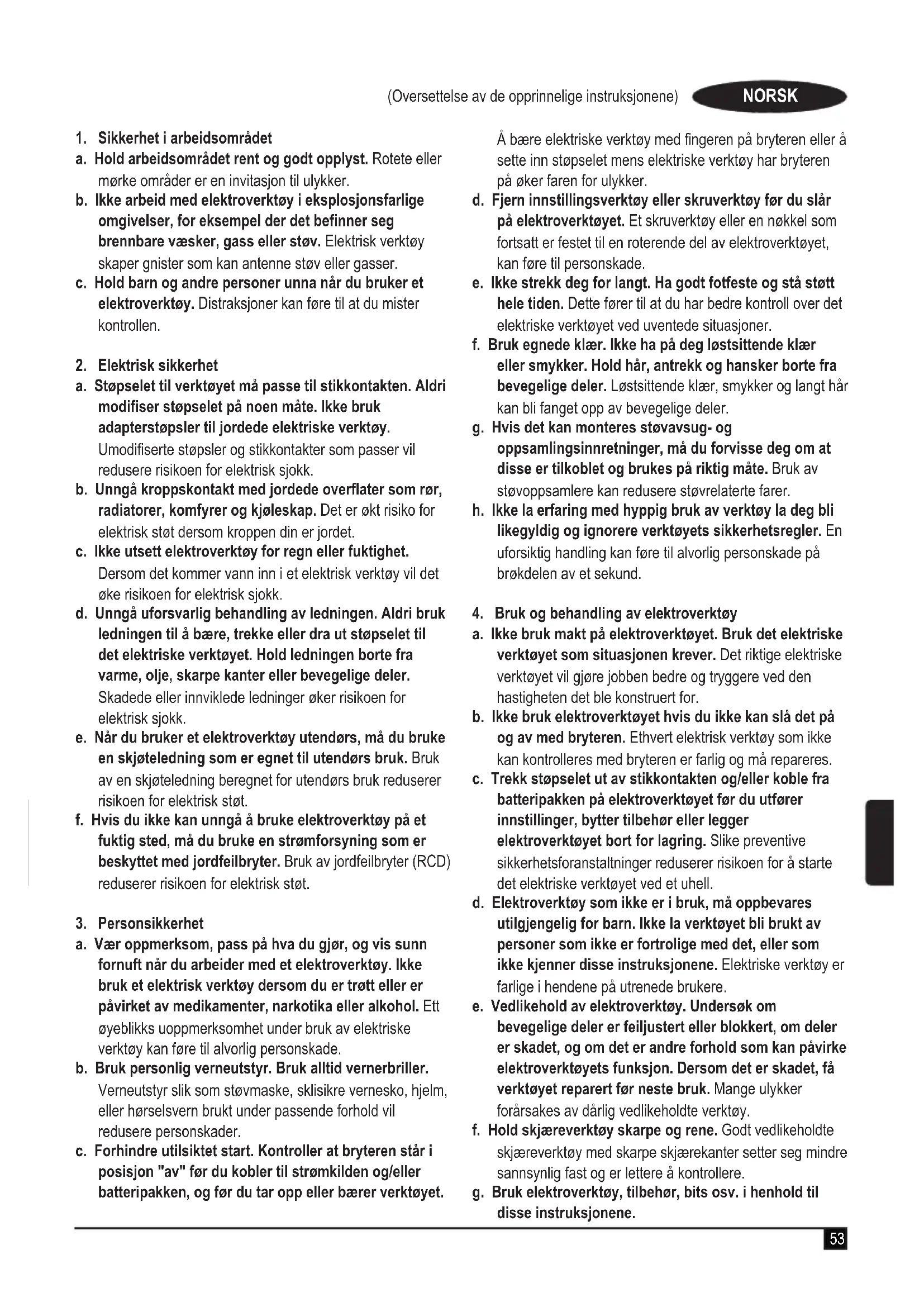 a. Hold arbeidsområdet rent og godt opplyst. Rotete eller mørke områder er en invitasjon til ulykker. b. Ikke arbeid med elektroverktøy i eksplosjonsfarlige omgivelser, for eksempel der det befinner seg brennbare væsker, gass eller støv. Elektrisk verktøy skaper gnister som kan antenne støv eller gasser. c. Hold barn og andre personer unna når du bruker et elektroverktøy. Distraksjoner kan føre til at du mister kontrollen.