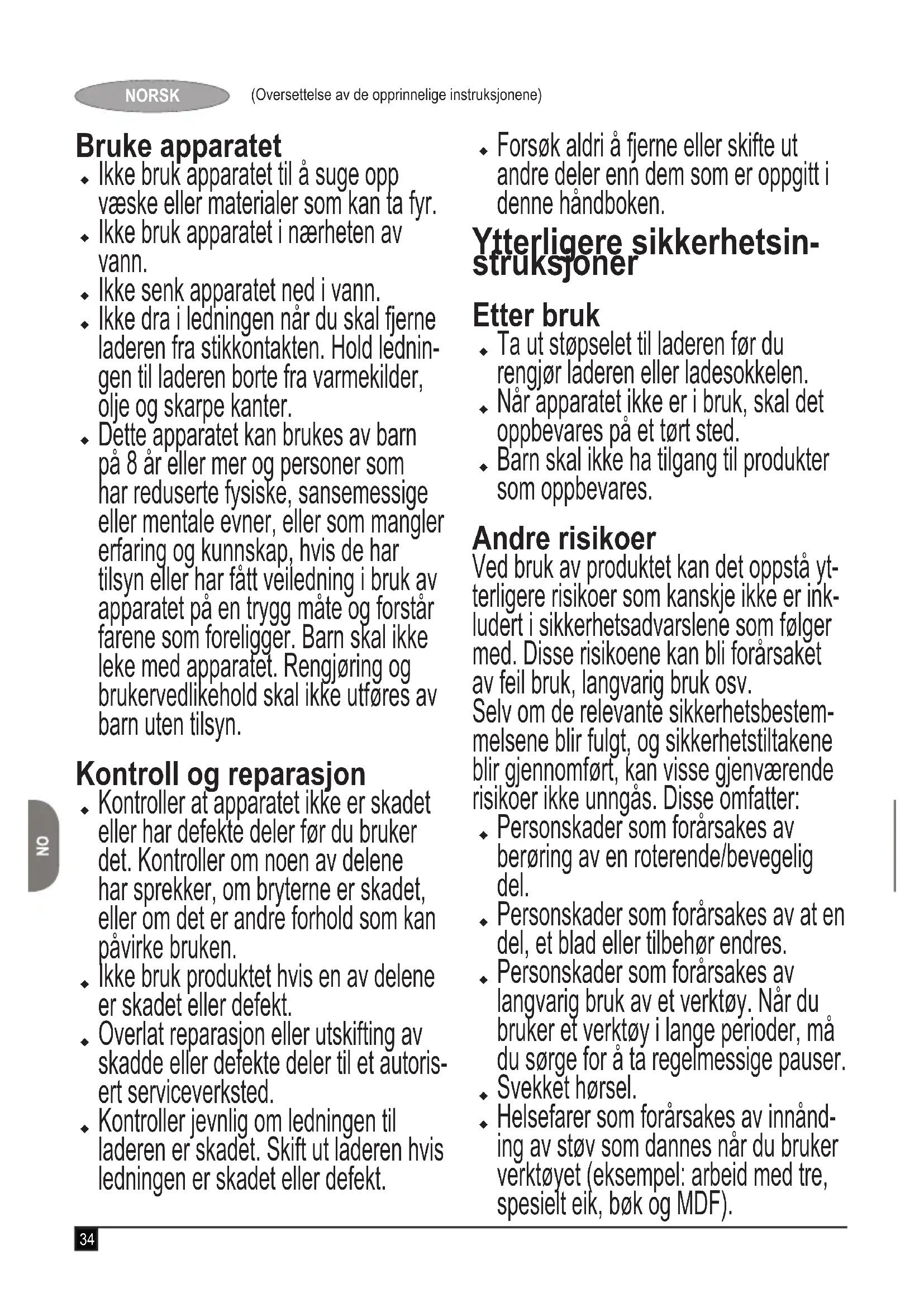 Advarsel! Når du bruker bat- teridrevne apparater, må du ta grunnleggende sikkerhetsforhold- sregler, blant annet dem som er beskrevet nedenfor, for å redusere risikoen for brann, batterilekkasje, personskade og skade på materi- ell. Les hele håndboken nøye før du bruker apparatet. Beregnet bruk er beskrevet i denne håndboken. Hvis du bruker annet tilbehør, kobler til annet utstyr eller bruker dette produktet til andre opp- gaver enn det som er anbefalt i denne håndboken, kan det føre til fare for personskade. Ta vare på denne håndboken for frem- tidig bruk.34 (Oversettelse av de opprinnelige instruksjonene) NORSK Bruke apparatet Ikke bruk apparatet til å suge opp væske eller materialer som kan ta fyr. Ikke bruk apparatet i nærheten av vann. Ikke senk apparatet ned i vann. Ikke dra i ledningen når du skal fjerne laderen fra stikkontakten. Hold lednin- gen til laderen borte fra varmekilder, olje og skarpe kanter. Dette apparatet kan brukes av barn på 8 år eller mer og personer som har reduserte fysiske, sansemessige eller mentale evner, eller som mangler erfaring og kunnskap, hvis de har tilsyn eller har fått veiledning i bruk av apparatet på en trygg måte og forstår farene som foreligger. Barn skal ikke leke med apparatet. Rengjøring og brukervedlikehold skal ikke utføres av barn uten tilsyn. Kontroll og reparasjon Kontroller at apparatet ikke er skadet eller har defekte deler før du bruker det. Kontroller om noen av delene har sprekker, om bryterne er skadet, eller om det er andre forhold som kan påvirke bruken. Ikke bruk produktet hvis en av delene er skadet eller defekt. Overlat reparasjon eller utskifting av skadde eller defekte deler til et autoris- ert serviceverksted. Kontroller jevnlig om ledningen til laderen er skadet. Skift ut laderen hvis ledningen er skadet eller defekt. Forsøk aldri å fjerne eller skifte ut andre deler enn dem som er oppgitt i denne håndboken. Ytterligere sikkerhetsin- struksjoner Etter bruk Ta ut støpselet til laderen før du rengjør laderen eller ladesokkelen. Når apparatet ikke er i bruk, skal det oppbevares på et tørt sted. Barn skal ikke ha tilgang til produkter som oppbevares. Andre risikoer Ved bruk av produktet kan det oppstå yt- terligere risikoer som kanskje ikke er ink- ludert i sikkerhetsadvarslene som følger med. Disse risikoene kan bli forårsaket av feil bruk, langvarig bruk osv. Selv om de relevante sikkerhetsbestem- melsene blir fulgt, og sikkerhetstiltakene blir gjennomført, kan visse gjenværende risikoer ikke unngås. Disse omfatter: Personskader som forårsakes av berøring av en roterende/bevegelig del. Personskader som forårsakes av at en del, et blad eller tilbehør endres. Personskader som forårsakes av langvarig bruk av et verktøy. Når du bruker et verktøy i lange perioder, må du sørge for å ta regelmessige pauser. Svekket hørsel. Helsefarer som forårsakes av innånd- ing av støv som dannes når du bruker verktøyet (eksempel: arbeid med tre, spesielt eik, bøk og MDF).35 (Oversettelse av de opprinnelige instruksjonene) NORSK Batterier og ladere Batterier