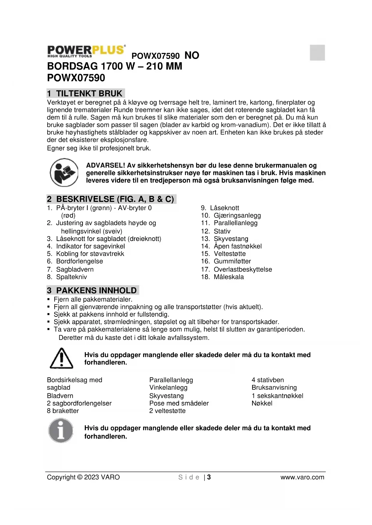 Pakk ut sagen og kontroller at alle delene følger med. Senk sagbladet under bordflaten (se 8.4 Innstilling av sagehøyde). Snu sagbladet opp ned.POWX07590 NO Copyright © 2023 VARO S i d e | 8 www.varo.com Merk: Kontakt forhandleren dersom en del mangler eller er skadet.