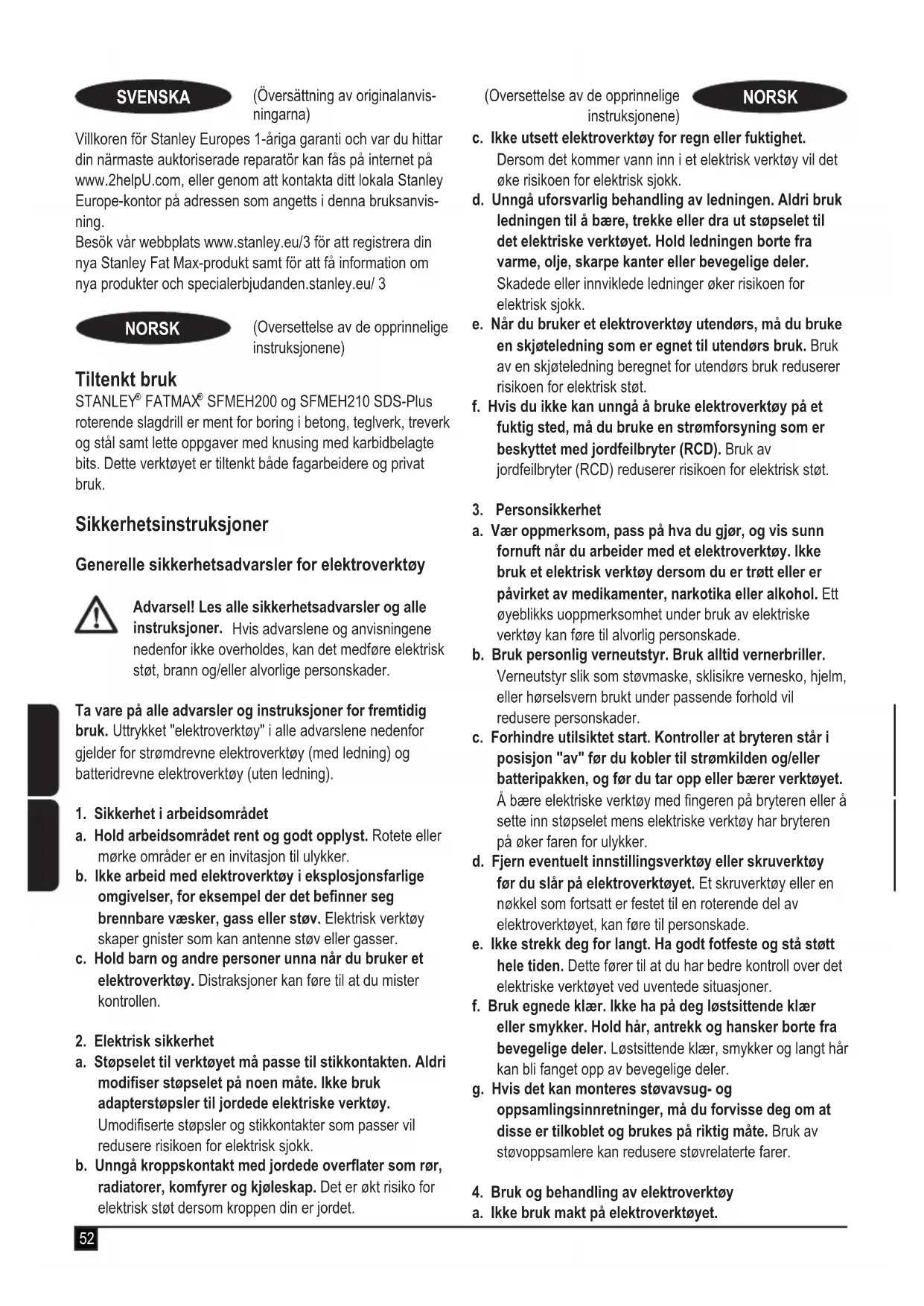 SFMEH200 og SFMEH210 SDS-Plus roterende slagdrill er ment for boring i betong, teglverk, treverk og stål samt lette oppgaver med knusing med karbidbelagte bits. Dette verktøyet er tiltenkt både fagarbeidere og privat bruk. Sikkerhetsinstruksjoner Generelle sikkerhetsadvarsler for elektroverktøy Advarsel! Les alle sikkerhetsadvarsler og alle instruksjoner. Hvis advarslene og anvisningene nedenfor ikke overholdes, kan det medføre elektrisk støt, brann og/eller alvorlige personskader. Ta vare på alle advarsler og instruksjoner for fremtidig bruk. Uttrykket "elektroverktøy" i alle advarslene nedenfor gjelder for strømdrevne elektroverktøy (med ledning) og batteridrevne elektroverktøy (uten ledning).