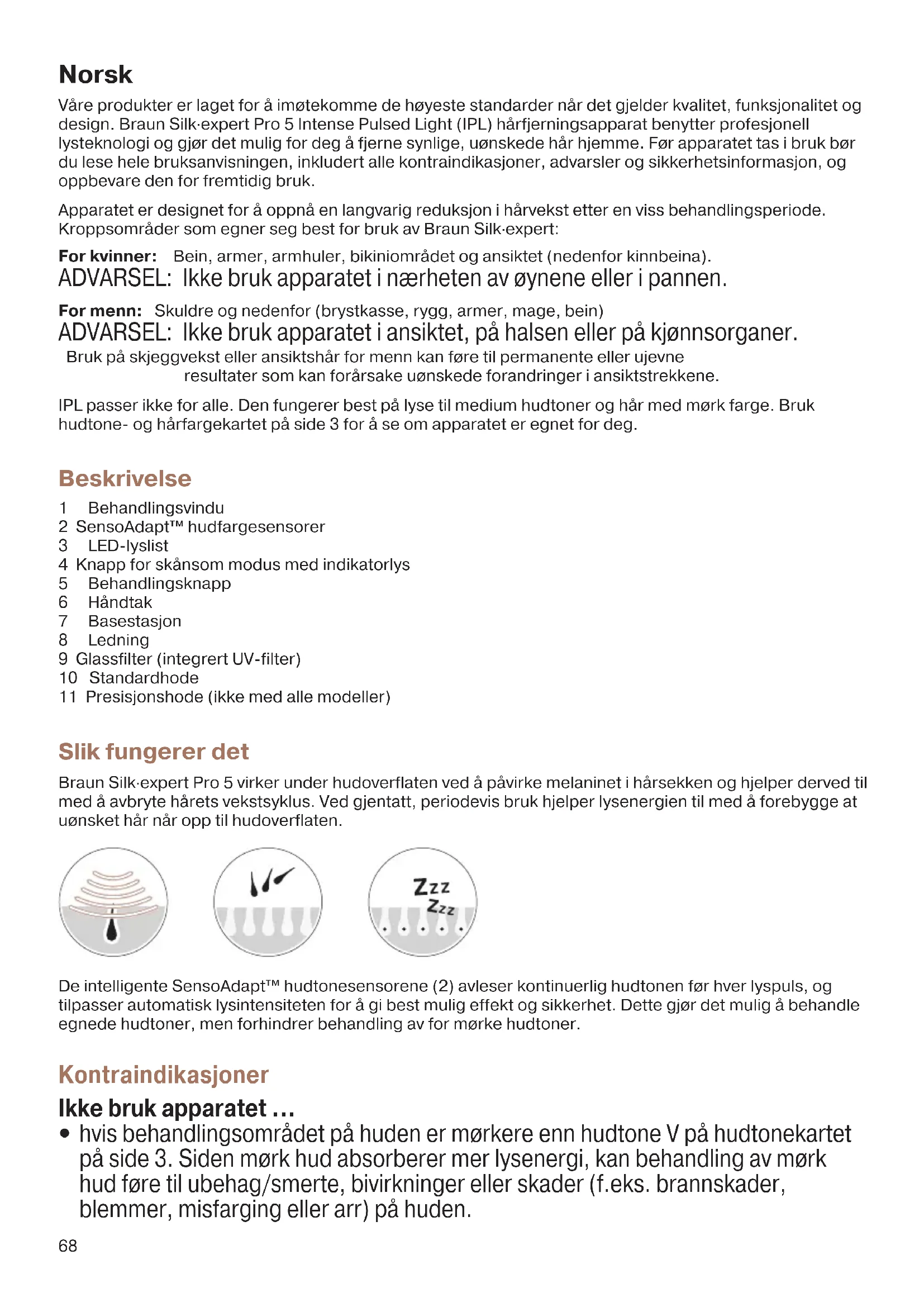- Hvis du oppdager pigmentforandringer i huden, for eksempel områder som blir lysere eller mørkere, må du avbryte bruken av apparatet. Kontakt lege for å avgjøre årsaken, som kan være en underliggende, medisinsk tilstand. 91816146_Victoria_Pro5_Euro_01.indd 7291816146_Victoria_Pro5_Euro_01.indd 72 28.06.18 14:4928.06.18 14:49 Business Use - P&G AUTHORIZED POA-00053643 Rev 001 Effective Date 2018-07-02 Printed 2018-07-25 Page 72 of 9473 Behandlingsplan Oppstartsfase 1 behandling per uke (4–12 uker) Vedlikehold Behandle huden etter behov, f.eks. med 1–2 måneders mellomrom Den vanlige hårvekstsyklusen varierer fra person til person og kan ta opp til 16 måneder, avhengig av kroppsområde (armhuler, legger, bikiniområdet). Siden behandlingen kun virker på hår som er i en vekstfase, er det viktig å gjennomføre gjentatte behandlinger for å få varig glatt hud. Derfor anbefaler vi en oppstartsfase med én behandling per uke over en periode på 4 til 12 uker. Dersom du ikke lenger ser at det vokser ut hår, er det ikke nødvendig å fullføre hele behandlingsperioden på 12 uker. Du kan gå over til vedlikeholdsbehandlinger. Etter behandlingen Når du har fullført behandlingen, må du trekke ut strømledningen fra stikkontakten. Etter behandlingen anbefaler vi å bruke en solkrem med solfaktor 15 hver gang de behandlede områdene blir utsatt for sol. Vi anbefaler at du unngår å utsette huden for alle typer kunstig sol, som for eksempel bruningssalonger eller solarium. Unngå alle aktiviteter og produkter som kan irritere huden i 24 timer etter behandlingen. Dette inkluderer varme bad eller badstue, bruk av trange klær, bruk av blekningskremer, parfymerte produkter eller peeling- produkter. Det som er nevnt ovenfor kan skape irritasjon, for eksempel kløe og rødhet på de behandlede områdene. Rengjøring og oppbevaring Etter hver behandling bør hudtonesensorene (2) og behandlingsvinduet (1) inspiseres for skade og tørkes av med en tørr, lofri klut. Hvis du ser merker eller svarte flekker, må du tørke dette av umiddelbart etter behandling. Ikke rør eller rengjør glassfilteret (9) umiddelbart etter bruk, men vent litt slik at det kan kjøle seg ned. Tørk av apparatet, og særlig behandlingsvinduet, etter bruk med en tørk, lofri klut. Ikke rens eller dypp apparatet i vann eller annen væske. For å sikre maksimal ytelse må du holde hodene (10, 11) med sine innebygde reflektorer fri for skitt, hår eller annet avfall. Skal ikke rengjøres i vann, men bruk en tørr klut til å rengjøre dem grundig. Oppbevar apparatet på et tørt og kjølig sted. Påse at behandlingsvinduet og hudsensorene er beskyttet mot skader. Mulige bivirkninger Noen vil oppleve lett ubehag (f.eks. varme eller rødhet i huden) når de bruker Braun Silk·expert – dette er normalt. Du kan føle varme og en prikkende følelse når du aktiverer lyspulsen, etterfulgt av rødhet i huden. Denne typen reaksjon forsvinner vanligvis i løpet av 24 timer. Bivirkninger oppstår vanligvis umiddelbart, eller innen 24 timer. I sjeldne tilfeller kan det ta opptil 72 timer før du merker bivirkninger. Hvis du opplever unormale hudreaksjoner, må du kontakte lege. Bivirkninger Dette må du eventuelt gjøre Varm eller prikkende følelse under behandlingen som vanligvis forsvinner etter noen få sekunder eller opptil ett minutt og som minsker for hver behandling. Dette er forventet og normalt for alle hårfjernings- behandlinger med IPL (intense lyspulser). Du kan fortsette å bruke apparatet som beskrevet i bruks anvisningen. Ubehag eller smerte som føles intens under behandlingen eller som vedvarer etter behandlingen. Avbryt bruk av apparatet og kontakt lege før du bruker det igjen. Rødhet i huden under eller etter behandlingen som forsvinner i løpet av minutter eller noen timer. Dette er forventet og normalt for alle hårfjernings- behandlinger med IPL. Du kan fortsette å bruke apparatet som beskrevet i bruksanvisningen så fort rødheten i huden er forsvunnet. 91816146_Victoria_Pro5_Euro_01.indd 7391816146_Victoria_Pro5_Euro_01.indd 73 28.06.18 14:4928.06.18 14:49 Business Use - P&G AUTHORIZED POA-00053643 Rev 001 Effective Date 2018-07-02 Printed 2018-07-25 Page 73 of 9474 Rødhet i huden som ikke forsvinner i løpet av 24 – 48 timer etter behandlingen. Avbryt bruken av apparatet og kontakt lege før du bruker det igjen. I veldig sjeldne tilfeller: Hevelse og rødhet rundt hårsekkene som forsvinner i løpet av to til tre dager. Du kan fortsette å bruke apparatet som beskrevet i bruksanvisningen så fort rødheten rundt hårsek- kene er forsvunnet. Hevelse og rødhet rundt hårsekkene som ikke forsvinner i løpet av to til tre dager. Avbryt bruken av apparatet og kontakt lege før du bruker det igjen. Midlertidige endringer i hudfarge (lysning eller mørkning). Dersom hudtonen endres, må du avbryte bruken av apparatet og kontakte lege. Økende hårvekst på områdene som er behandlet (mer vanlig hos brukere fra områdene rundt Middelhavet). Dersom økningen vedvarer etter flere behand- linger, må du avbryte bruken av apparatet og kontakte lege. Feilsøking Følgende feilsøkingsguide kan brukes som utgangspunkt for å løse problemer som kan oppstå med dette apparatet. Problem Løsning LED-lyslisten lyser ikke når behandlingsvinduet plasseres på huden. Kontroller at apparatet er koblet til stikkontakt. Trykk på knappen for skånsom modus (4) for å aktivere det. Se til at begge hudtonesensorene er helt i kontakt med huden. Hvis nødvendig, kan du forsøke å bevege apparatet slik at begge hudtonesensorene får hudkontakt. Apparatet fungerer ikke på små områder. Bruk presisjonshodet (hvis tilgjengelig) på små områder som er vanskelig tilgjengelige. Se til at begge hudtonesensorer har kontakt med huden. Blinkende sekvens reduseres. Apparatet er i varmebeskyttelsesmodus. La apparatet kjøle seg ned for å komme tilbake til normal hastighet igjen. På LED-lyslisten lyser kun det første LED-