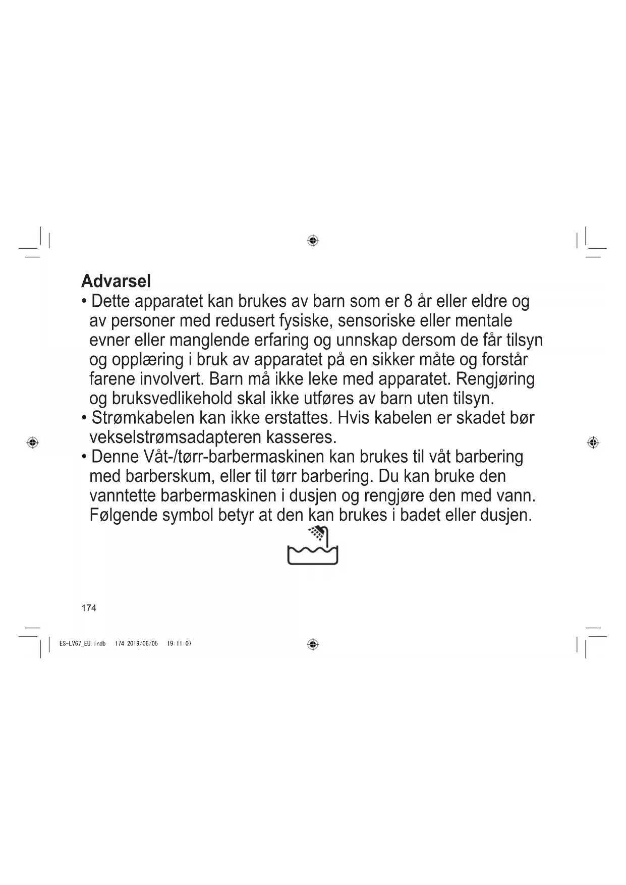 - Denne Våt‑/tørr‑barbermaskinen kan brukes til våt barbering med barberskum, eller til tørr barbering. Du kan bruke den vanntette barbermaskinen i dusjen og rengjøre den med vann. Følgende symbol betyr at den kan brukes i badet eller dusjen. ES-LV67_EU.indb 174 2019/06/05 19:11:07175 TR RO H SK CZ PL FIN S N P DK E NL I F D GB