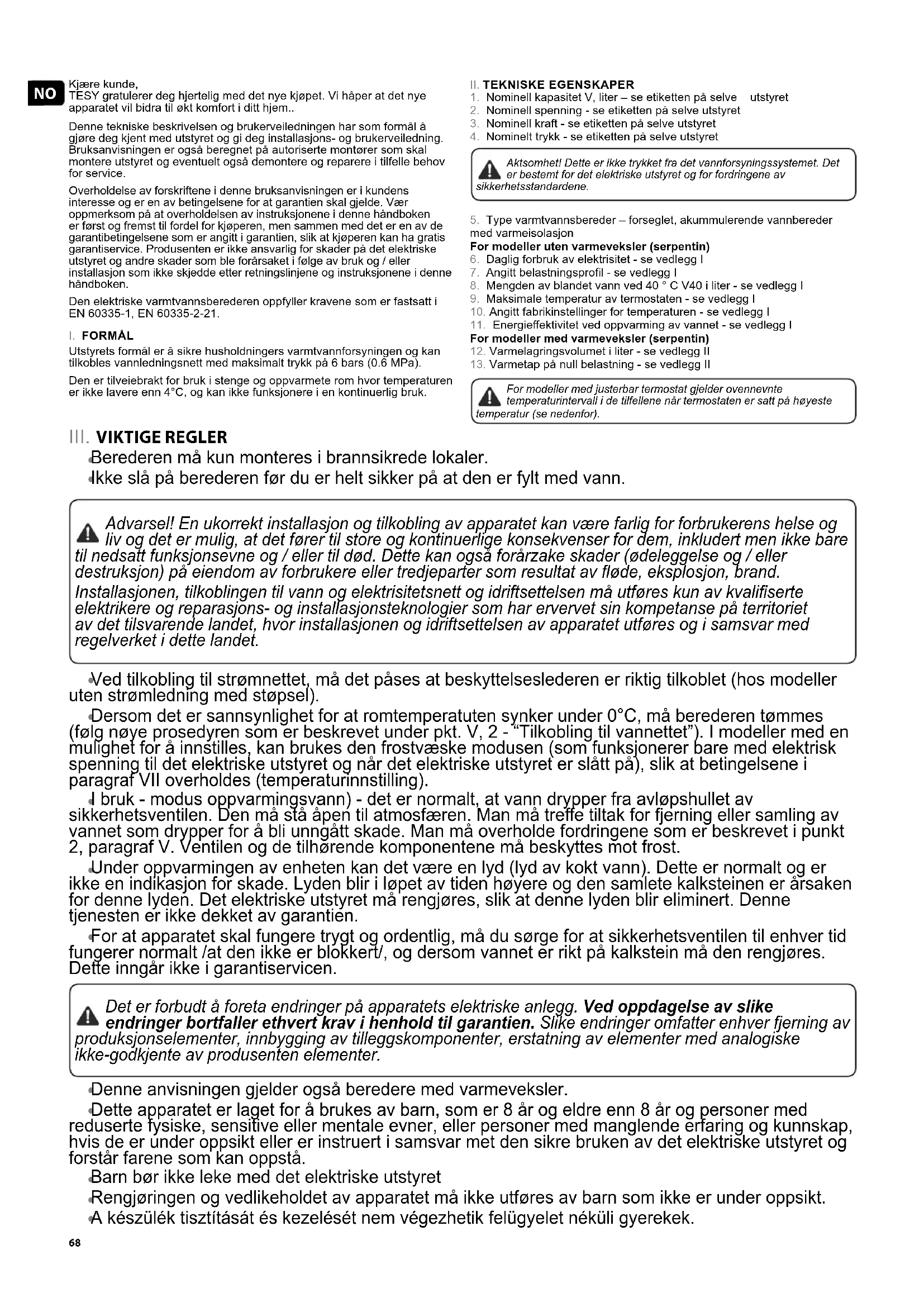 A készülék tisztítását és kezelését nem végezhetik felügyelet néküli gyerekek. Kjære kunde, TESY gratulerer deg hjertelig med det nye kjøpet. Vi håper at det nye apparatet vil bidra til økt komfort i ditt hjem.. Denne tekniske beskrivelsen og brukerveiledningen har som formål å gjøre deg kjent med utstyret og gi deg installasjons- og brukerveiledning. Bruksanvisningen er også beregnet på autoriserte montører som skal montere utstyret og eventuelt også demontere og reparere i tilfelle behov for service. Overholdelse av forskriftene i denne bruksanvisningen er i kundens interesse og er en av betingelsene for at garantien skal gjelde. Vær oppmerksom på at overholdelsen av instruksjonene i denne håndboken er først og fremst til fordel for kjøperen, men sammen med det er en av de garantibetingelsene som er angitt i garantien, slik at kjøperen kan ha gratis garantiservice. Produsenten er ikke ansvarlig for skader på det elektriske utstyret og andre skader som ble forårsaket i følge av bruk og / eller installasjon som ikke skjedde etter retningslinjene og instruksjonene i denne håndboken. Den elektriske varmtvannsberederen oppfyller kravene som er fastsatt i EN 60335-1, EN 60335-2-21.