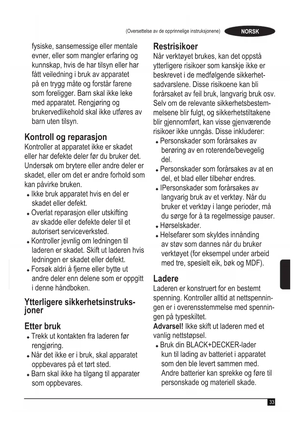 Advarsel! Les alle sikkerhetsadvarsler og alle instruksjoner. Hvis advarslene og anvisningene nedenfor ikke overholdes, kan det medføre elektrisk støt, brann og/eller alvorlige personskader. u Beregnet bruk er beskrevet i denne håndboken. Hvis du bruker annet tilbehør, kobler til annet utstyr eller bruker dette apparatet til andre oppgaver enn det som er anbefalt i denne håndboken, kan det føre til fare for personskade. u Ta vare på denne håndboken for fremtidig bruk. Bruke produktet u Ikke bruk apparatet til å suge opp væske eller materialer som kan ta fyr. u Ikke senk produktet ned i vann.u Ikke dra i ledningen når du skal fjerne laderen fra stikkontakten. Hold ledningen til laderen borte fra varmekilder, olje og skarpe kanter. u Dette apparatet kan brukes av barn som er 8 år eller eldre samt av personer som har reduserte33 (Oversettelse av de opprinnelige instruksjonene) NORSK fysiske, sansemessige eller mentale evner, eller som mangler erfaring og kunnskap, hvis de har tilsyn eller har fått veiledning i bruk av apparatet på en trygg måte og forstår farene som foreligger. Barn skal ikke leke med apparatet. Rengjøring og brukervedlikehold skal ikke utføres av barn uten tilsyn. Kontroll og reparasjon Kontroller at apparatet ikke er skadet eller har defekte deler før du bruker det. Undersøk om brytere eller andre deler er skadet, eller om det er andre forhold som kan påvirke bruken. u Ikke bruk apparatet hvis en del er skadet eller defekt. u Overlat reparasjon eller utskifting av skadde eller defekte deler til et autorisert serviceverksted. u Kontroller jevnlig om ledningen til laderen er skadet. Skift ut laderen hvis ledningen er skadet eller defekt. u Forsøk aldri å fjerne eller bytte ut andre deler enn delene som er oppgitt i denne håndboken. Ytterligere sikkerhetsinstruks- joner Etter bruk u Trekk ut kontakten fra laderen før rengjøring. u Når det ikke er i bruk, skal apparatet oppbevares på et tørt sted. u Barn skal ikke ha tilgang til apparater som oppbevares. Restrisikoer Når verktøyet brukes, kan det oppstå ytterligere risikoer som kanskje ikke er beskrevet i de medfølgende sikkerhet- sadvarslene. Disse risikoene kan bli forårsaket av feil bruk, langvarig bruk osv. Selv om de relevante sikkerhetsbestem- melsene blir fulgt, og sikkerhetstiltakene blir gjennomført, kan visse gjenværende risikoer ikke unngås. Disse inkluderer: u Personskader som forårsakes av berøring av en roterende/bevegelig del. u Personskader som forårsakes av at en del, et blad eller tilbehør endres. u IPersonskader som forårsakes av langvarig bruk av et verktøy. Når du bruker et verktøy i lange perioder, må du sørge for å ta regelmessige pauser. u Hørselskader.u Helsefarer som skyldes innånding av støv som dannes når du bruker verktøyet (for eksempel under arbeid med tre, spesielt eik, bøk og MDF). Ladere Laderen er konstruert for en bestemt spenning. Kontroller alltid at nettspennin- gen er i overensstemmelse med spennin- gen på typeskiltet. Advarsel! Ikke skift ut laderen med et vanlig nettstøpsel. u Bruk din BLACK+DECKER-lader kun til lading av batteriet i apparatet som den ble levert sammen med. Andre batterier kan sprekke og føre til personskade og materiell skade.34 (Oversettelse av de opprinnelige instruksjonene)NORSKu Prøv aldri å lade ikke-oppladbare batterier. u Hvis strømledningen blir skadet, må den byttes av produsenten eller et autorisert BLACK+DECKER- servicesenter for å unngå fare. u Ikke utsett laderen for vann.u Ikke åpne laderen.u Ikke stikk gjenstander eller ngre inn i laderen. u Apparatet/batteriet må plasseres på et sted med god lufting når det lades. Elektrisk sikkerhet Symboler på laderen Les hele denne håndboken nøye før du bruker produktet.