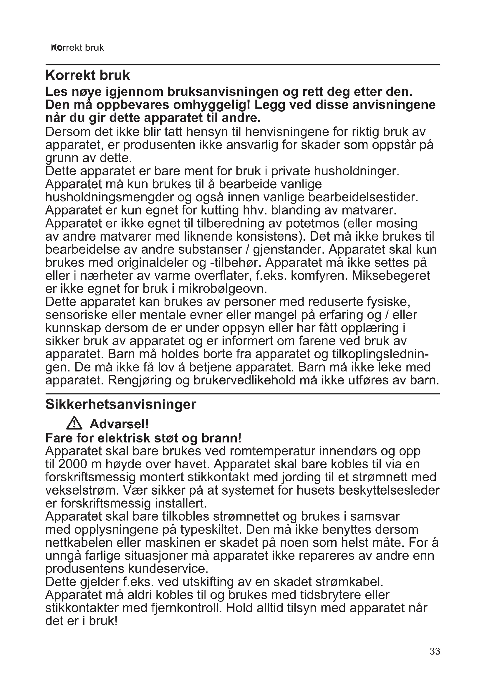 Korrekt bruk Korrekt bruk Les nøye igjennom bruksanvisningen og rett deg etter den. Den må oppbevares omhyggelig! Legg ved disse anvisningene når du gir dette apparatet til andre. Dersom det ikke blir tatt hensyn til henvisningene for riktig bruk av apparatet, er produsenten ikke ansvarlig for skader som oppstår på grunn av dette. Dette apparatet er bare ment for bruk i private husholdninger. Apparatet må kun brukes til å bearbeide vanlige husholdningsmengder og også innen vanlige bearbeidelsestider. Apparatet er kun egnet for kutting hhv. blanding av matvarer. Apparatet er ikke egnet til tilberedning av potetmos (eller mosing av andre matvarer med liknende konsistens). Det må ikke brukes til bearbeidelse av andre substanser / gjenstander. Apparatet skal kun brukes med originaldeler og -tilbehør. Apparatet må ikke settes på eller i nærheter av varme overflater, f.eks. komfyren. Miksebegeret er ikke egnet for bruk i mikrobølgeovn. Dette apparatet kan brukes av personer med reduserte fysiske, sensoriske eller mentale evner eller mangel på erfaring og / eller kunnskap dersom de er under oppsyn eller har fått opplæring i sikker bruk av apparatet og er informert om farene ved bruk av apparatet. Barn må holdes borte fra apparatet og tilkoplingslednin- gen. De må ikke få lov å betjene apparatet. Barn må ikke leke med apparatet. Rengjøring og brukervedlikehold må ikke utføres av barn. Sikkerhetsanvisninger W Advarsel! Fare for elektrisk støt og brann! Apparatet skal bare brukes ved romtemperatur innendørs og opp til 2000 m høyde over havet. Apparatet skal bare kobles til via en forskriftsmessig montert stikkontakt med jording til et strømnett med vekselstrøm. Vær sikker på at systemet for husets beskyttelsesleder er forskriftsmessig installert. Apparatet skal bare tilkobles strømnettet og brukes i samsvar med opplysningene på typeskiltet. Den må ikke benyttes dersom nettkabelen eller maskinen er skadet på noen som helst måte. For å unngå farlige situasjoner må apparatet ikke repareres av andre enn produsentens kundeservice. Dette gjelder f.eks. ved utskifting av en skadet strømkabel. Apparatet må aldri kobles til og brukes med tidsbrytere eller stikkontakter med fjernkontroll. Hold alltid tilsyn med apparatet når det er i bruk!34 no Sikkerhetsanvisninger Det anbefales ikke å la apparatet være innkoplet lenger enn det som er nødvendig for bearbeidingen av de ingrediensene som skal mikses. La aldri strømkabelen komme i berøring med varme deler, og trekk den aldri over skarpe kanter. Basismaskinen må aldri dyppes ned i vann eller vaskes i oppvaskmaskin. Ikke bruk apparatet med fuktige hender, og ikke la det gå på tomgang. Apparatet må ikke senkes ned i ingrediensene som skal mikses til ut over forbindelsen mellom miksefoten og basismaskinen. Apparatet må alltid kobles fra nettet etter bruk, når det ikke er under tilsyn, før det settes sammen, tas fra hverandre eller rengjøres og ved feil. W Advarsel! Fare for skade! Vær forsiktig når du bruker skarpe kniver, når du tømmer bollen og ved rengjøring. Vent til kniven på miksefoten har stanset rett etter at apparatet har vært i bruk. Apparatet må slås av og kobles fra nettet før det skiftes tilbehørsdeler eller ekstrautstyr som beveges under bruk. Tilbehøret må kun settes på og tas av når apparatet er stanset. Grip aldri inn i kniven på miksefoten. Rengjør aldri kniven på miksefoten med bare hender. Bruk børste. W Advarsel! Fare for skolding! Vær forsiktig når du arbeider med varme ingredienser som skal mikses. Varme ingredienser kan sprute ut under miksingen. Miksefoten må aldri settes på varme overflater eller brukes for miksing av svært varme ingredienser. Kokende ingredienser må kjøles ned til 80°C eller mindre før de bearbeides. Når stavmikseren skal brukes i en gryte, må gryten alltid tas bort fra kokeplaten på forhånd. W Advarsel! Kvelningsfare! La aldri små barn leke med innpakningsmaterialet.35