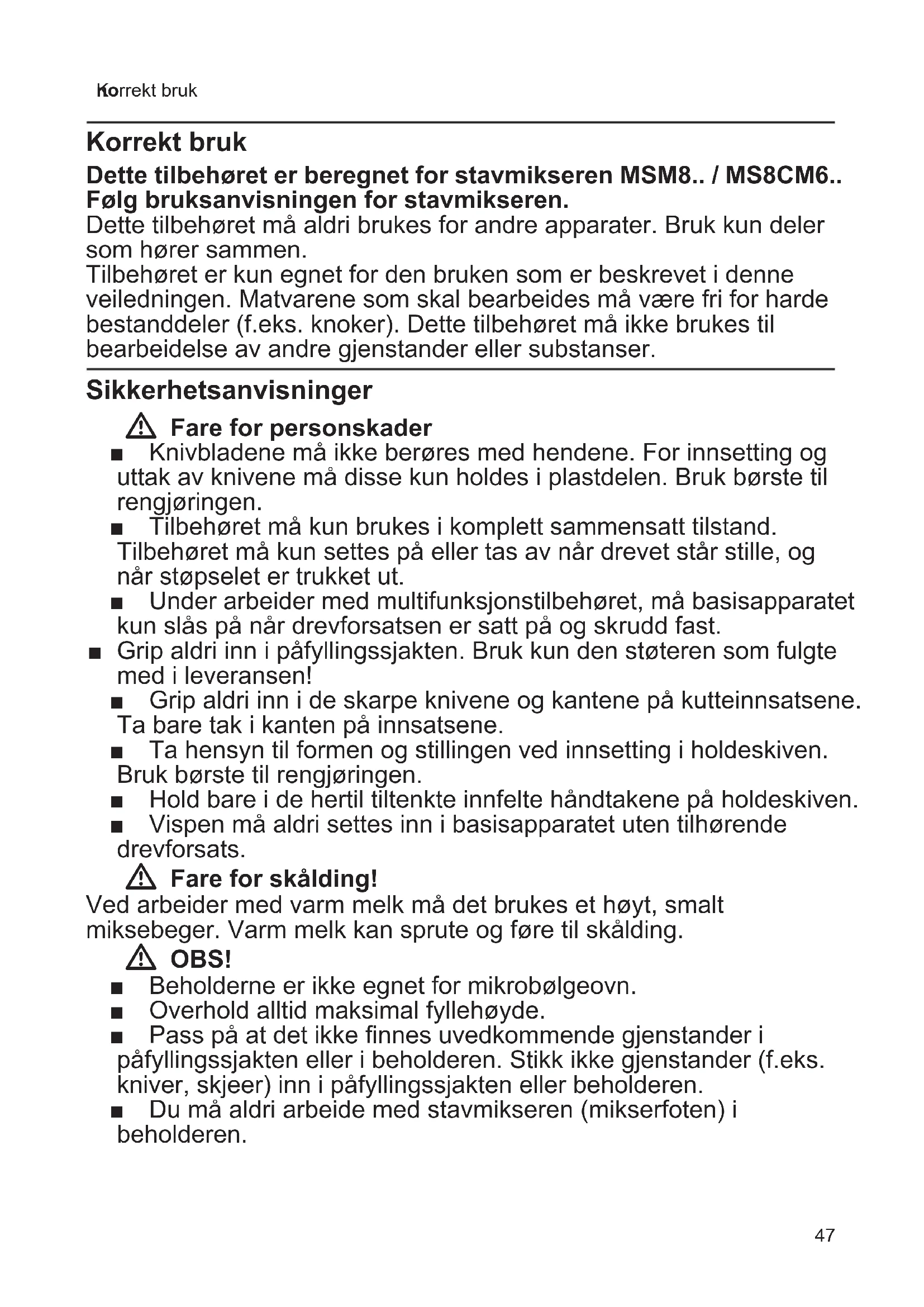 Korrekt bruk Korrekt bruk Dette tilbehøret er beregnet for stavmikseren MSM8.. / MS8CM6.. Følg bruksanvisningen for stavmikseren. Dette tilbehøret må aldri brukes for andre apparater. Bruk kun deler som hører sammen. Tilbehøret er kun egnet for den bruken som er beskrevet i denne veiledningen. Matvarene som skal bearbeides må være fri for harde bestanddeler (f.eks. knoker). Dette tilbehøret må ikke brukes til bearbeidelse av andre gjenstander eller substanser. Sikkerhetsanvisninger W Fare for personskader ■ Knivbladene må ikke berøres med hendene. For innsetting og uttak av knivene må disse kun holdes i plastdelen. Bruk børste til rengjøringen. ■ Tilbehøret må kun brukes i komplett sammensatt tilstand. Tilbehøret må kun settes på eller tas av når drevet står stille, og når støpselet er trukket ut. ■ Under arbeider med multifunksjonstilbehøret, må basisapparatet kun slås på når drevforsatsen er satt på og skrudd fast. ■ Grip aldri inn i påfyllingssjakten. Bruk kun den støteren som fulgte med i leveransen! ■ Grip aldri inn i de skarpe knivene og kantene på kutteinnsatsene. Ta bare tak i kanten på innsatsene. ■ Ta hensyn til formen og stillingen ved innsetting i holdeskiven. Bruk børste til rengjøringen. ■ Hold bare i de hertil tiltenkte innfelte håndtakene på holdeskiven. ■ Vispen må aldri settes inn i basisapparatet uten tilhørende drevforsats. W Fare for skålding! Ved arbeider med varm melk må det brukes et høyt, smalt miksebeger. Varm melk kan sprute og føre til skålding. W OBS! ■ Beholderne er ikke egnet for mikrobølgeovn. ■ Overhold alltid maksimal fyllehøyde. ■ Pass på at det ikke finnes uvedkommende gjenstander i påfyllingssjakten eller i beholderen. Stikk ikke gjenstander (f.eks. kniver, skjeer) inn i påfyllingssjakten eller beholderen. ■ Du må aldri arbeide med stavmikseren (mikserfoten) i beholderen.48 no Sikkerhetsanvisninger ■ Følgende deler må aldri senkes ned i væsker eller holdes under rennende vann og ikke rengjøres i oppvaskmaskin: Drevpåsats, drevforsats, lokk med drev. W Viktig! Det er tvingende nødvendig å rengjøre tilbehøret grundig etter hver bruk, eller når det ikke har vært i bruk i en lengre periode. X ”Rengjøring og pleie” se side 52 Før første gangs bruk Før det nye tilbehøret kan tas i bruk, må det pakkes fullstendig ut, rengjøres og kontrolleres. OBS! Du må aldri ta i bruk et tilbehør som har skader! ■ Ta alle tilbehørsdelene ut av emballasjen og fjern eksisterende forpakningsmateriell. ■ Kontroller at alle delene er fullstendige og ikke har synlige skader. X Bilde A ■ Rengjør og tørk alle deler grundig før første bruk. X ”Rengjøring og pleie” se side 52 Symboler og markeringer Symbol Betydning