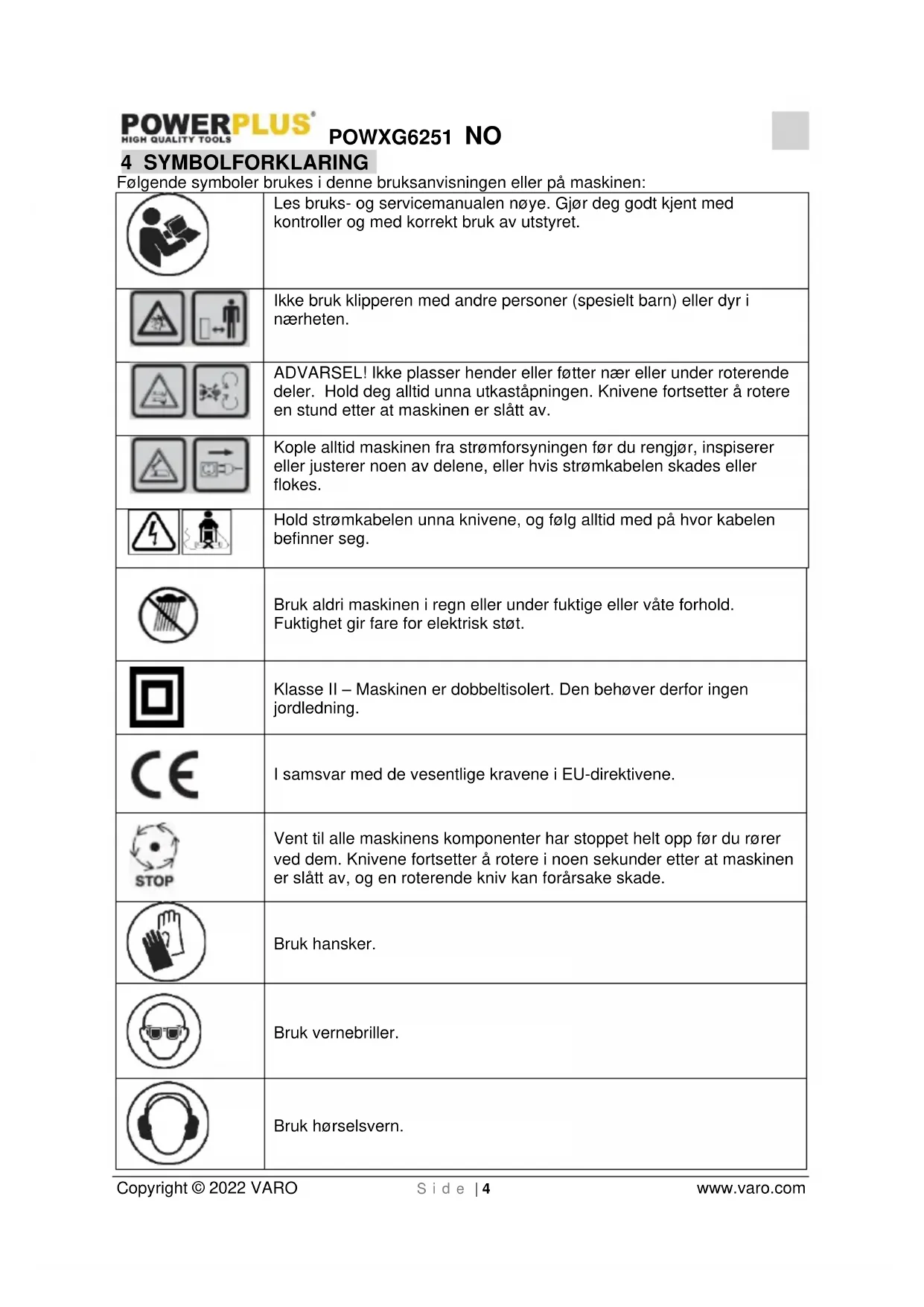 - Husk at operatøren eller brukeren er ansvarlig for ikke å utsette andre personer eller deres eiendom for skade eller farer.POWXG6251 NO Copyright © 2022 VARO S i d e | 7 www.varo.com