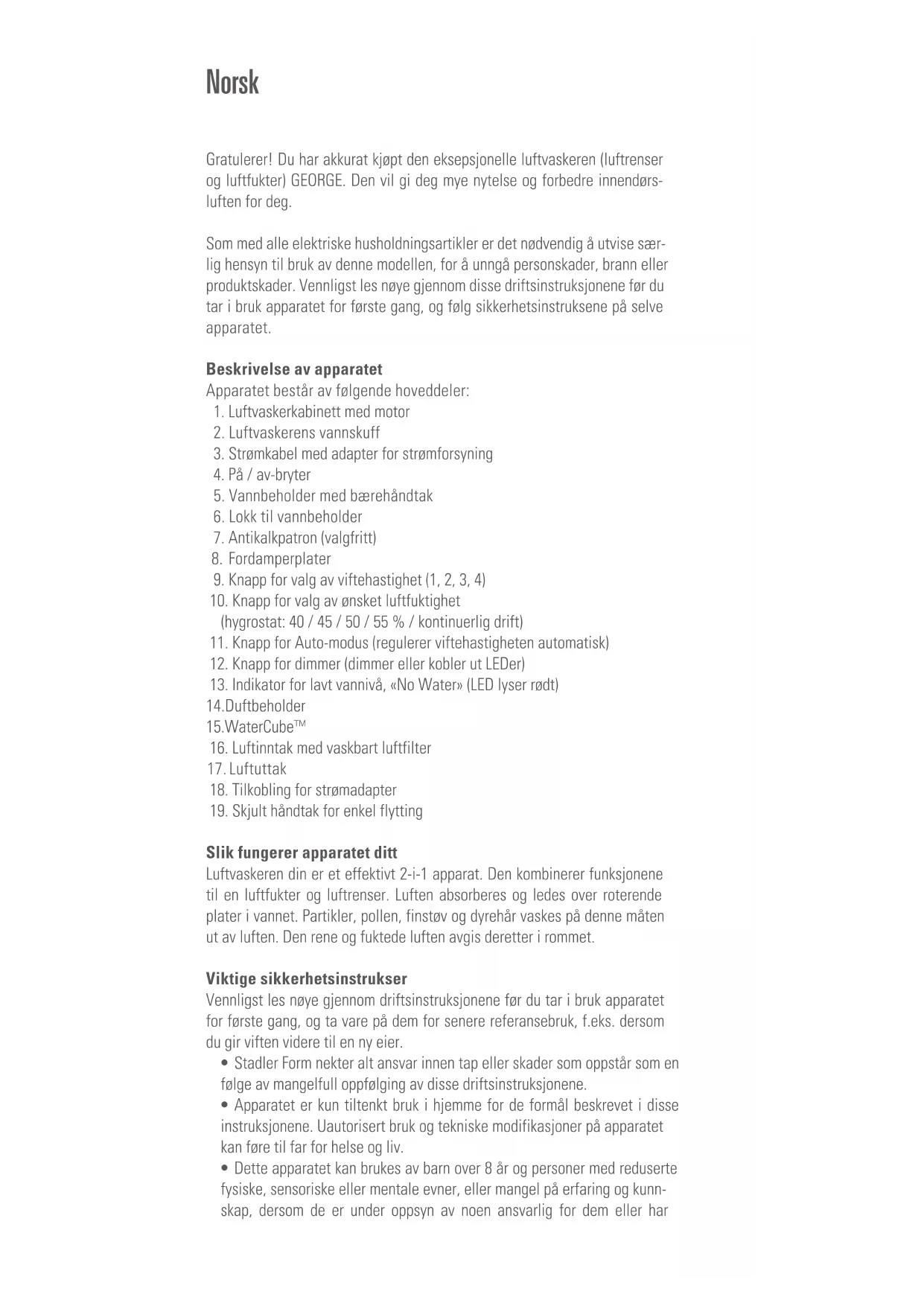 Slik fungerer apparatet ditt Luftvaskeren din er et effektivt 2-i-1 apparat. Den kombinerer funksjonene til en luftfukter og luftrenser. Luften absorberes og ledes over roterende plater i vannet. Partikler, pollen, finstøv og dyrehår vaskes på denne måten ut av luften. Den rene og fuktede luften avgis deretter i rommet. Viktige sikkerhetsinstrukser Vennligst les nøye gjennom driftsinstruksjonene før du tar i bruk apparatet for første gang, og ta vare på dem for senere referansebruk, f.eks. dersom du gir viften videre til en ny eier.