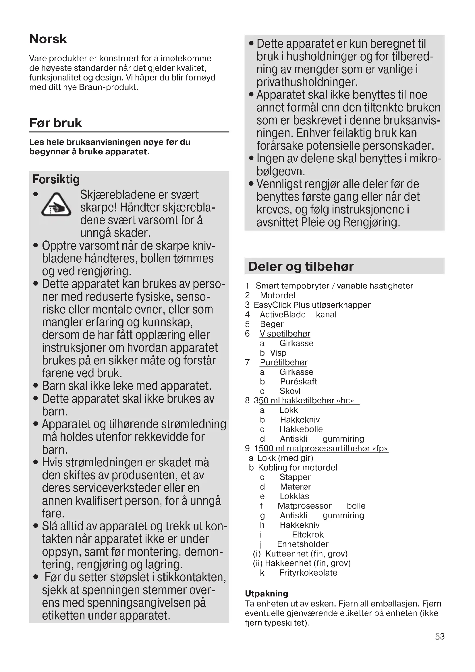 Vennligst rengjør alle deler før de benyttes første gang eller når det kreves, og følg instruksjonene i avsnittet Pleie og Rengjøring. Deler og tilbehør 1 Smart tempobryter / variable hastigheter 2 Motordel 3 EasyClick Plus utløserknapper 4 ActiveBlade kanal 5 Beger 6 Vispetilbehør a Girkasse b Visp 7 Purétilbehør a Girkasse b Puréskaft c Skovl 8 350 ml hakketilbehør «hc» a Lokk b Hakkekniv c Hakkebolle d Antiskli gummiring 9 1500 ml matprosessortilbehør «fp» a Lokk (med gir) b Kobling for motordel c Stapper d Materør e Lokklås f Matprosessor bolle g Antiskli gummiring h Hakkekniv i Eltekrok j Enhetsholder (i) Kutteenhet (fin, grov) (ii) Hakkeenhet (fin, grov) k Frityrkokeplate Utpakning Ta enheten ut av esken. Fjern all emballasjen. Fjern eventuelle gjenværende etiketter på enheten (ikke fjern typeskiltet). 5722113494_02_MQ7075x-7077x-7087x INT_S6-144.indd 535722113494_02_MQ7075x-7077x-7087x INT_S6-144.indd 53 12.07.19 08:1012.07.19 08:1054 Slik brukes apparatet Smartspeed bryter for variable hastigheter Et trykk, alle hastigheter. Jo mer du trykker, desto større hastighet. Jo høyere hastighet, desto raskere og finere mikse- og hakkeresultater. Enhåndsoperasjon: Smartspeed bryter (1) lar deg skru på apparatet og kontrollere hastigheten med kun en hånd. ActiveBlade kanal (A) Håndmikseren er utstyrt med en ActiveBlade kanal, som forlenger kniven til bunnen av klokken. Justeringen foretas automatisk til trykket som trengs ved miksing, og egner seg fremfor alt til å mikse harde matvarer som rå frukt og grønnsaker. Den egner seg også til å lage dipp, saus, salatdressing, suppe, babymat, samt drikke, smoothies og milkshake. For best resultat brukes den høyeste hastigheten. Montering og betjening