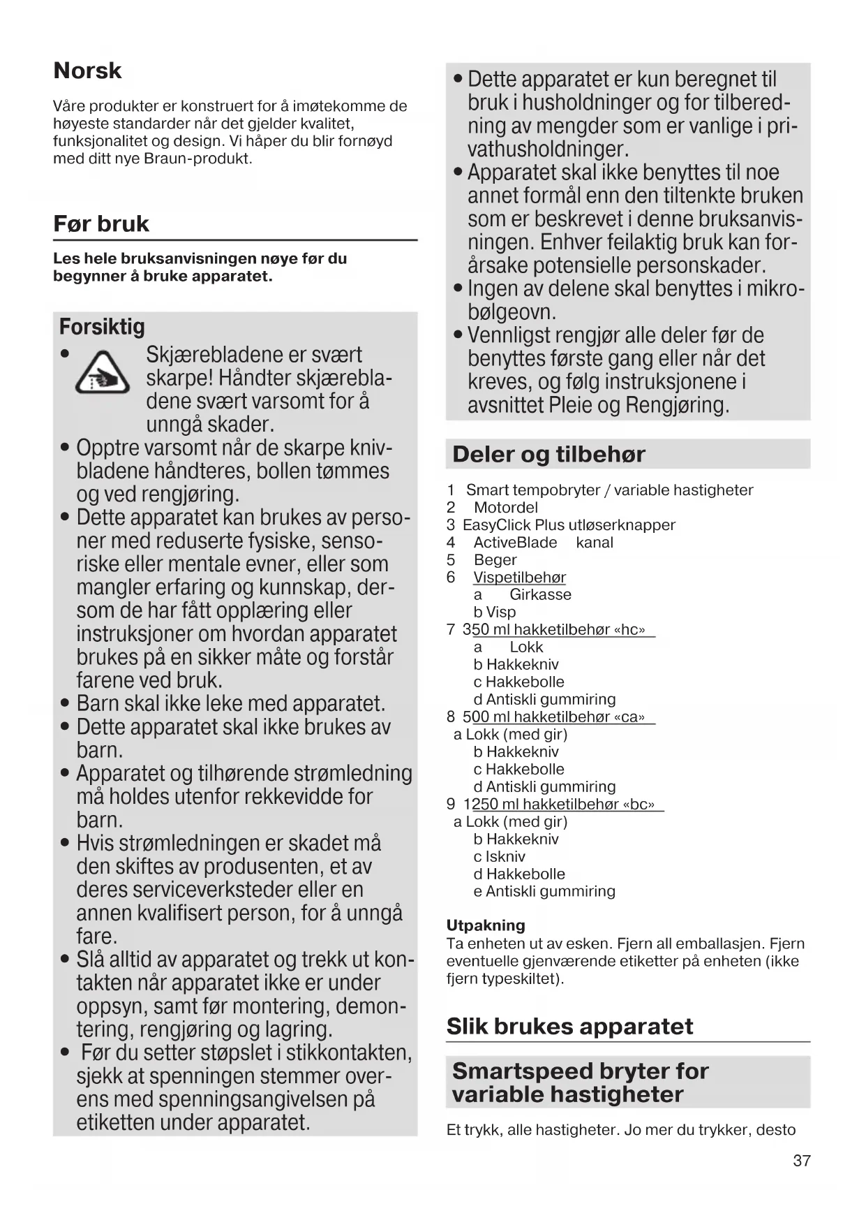 Vennligst rengjør alle deler før de benyttes første gang eller når det kreves, og følg instruksjonene i avsnittet Pleie og Rengjøring. Deler og tilbehør 1 Smart tempobryter / variable hastigheter 2 Motordel 3 EasyClick Plus utløserknapper 4 ActiveBlade kanal 5 Beger 6 Vispetilbehør a Girkasse b Visp 7 350 ml hakketilbehør «hc» a Lokk b Hakkekniv c Hakkebolle d Antiskli gummiring 8 500 ml hakketilbehør «ca» a Lokk (med gir) b Hakkekniv c Hakkebolle d Antiskli gummiring 9 1250 ml hakketilbehør «bc» a Lokk (med gir) b Hakkekniv c Iskniv d Hakkebolle e Antiskli gummiring Utpakning Ta enheten ut av esken. Fjern all emballasjen. Fjern eventuelle gjenværende etiketter på enheten (ikke fjern typeskiltet). Slik brukes apparatet Smartspeed bryter for variable hastigheter Et trykk, alle hastigheter. Jo mer du trykker, desto 5722113444_01_MQ 7000x_7045x_INT_S6-96.indd 375722113444_01_MQ 7000x_7045x_INT_S6-96.indd 37 04.07.19 13:5404.07.19 13:5438 større hastighet. Jo høyere hastighet, desto raskere og finere mikse- og hakkeresultater. Enhåndsoperasjon: Smartspeed bryter (1) lar deg skru på apparatet og kontrollere hastigheten med kun en hånd. ActiveBlade kanal (A) Håndmikseren er utstyrt med en ActiveBlade kanal, som forlenger kniven til bunnen av klokken. Justeringen foretas automatisk til trykket som trengs ved miksing, og egner seg fremfor alt til å mikse harde matvarer som rå frukt og grønnsaker. Den egner seg også til å lage dipp, saus, salatdressing, suppe, babymat, samt drikke, smoothies og milkshake. For best resultat brukes den høyeste hastigheten. Montering og betjening