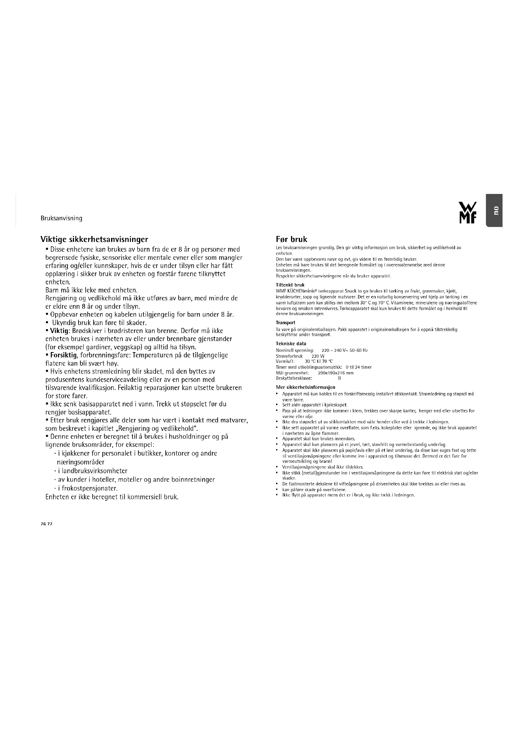 - Denne enheten er beregnet til å brukes i husholdninger og på lignende bruksområder, for eksempel: ⋅ i kjøkkener for personalet i butikker, kontorer og andre næringsområder ⋅ i landbruksvirksomheter ⋅ av kunder i hoteller, moteller og andre boinnretninger ⋅ i frokostpensjonater. Enheten er ikke beregnet til kommersiell bruk. Før bruk Les bruksanvisningen grundig. Den gir viktig informasjon om bruk, sikkerhet og vedlikehold av enheten. Den bør være oppbevares nøye og evt, gis videre til en fremtidig bruker. Enheten må bare brukes til det beregnede formålet og i overensstemmelse med denne bruksanvisningen. Respekter sikkerhetsanvisningene når du bruker apparatet. Tiltenkt bruk WMF KÜCHENminis® tørkeapparat Snack to go brukes til tørking av frukt, grønnsaker, kjøtt, krydderurter, sopp og lignende matvarer. Det er en naturlig konservering ved hjelp av tørking i en varm luftstrøm som kan stilles inn mellom 30° C og 70° C. Vitaminene, mineralene og næringsstoffene bevares og smaken intensiveres. Tørkeapparatet skal kun brukes til dette formålet og i henhold til denne bruksanvisningen. Transport Ta vare på originalemballasjen. Pakk apparatet i originalemballasjen for å oppnå tilstrekkelig beskyttelse under transport. Tekniske data Nominell spenning: 220 – 240 V~ 50-60 Hz Strømforbruk 220 W Varmluft: 30 °C til 70 °C Timer med utkoblingsautomatikk: 0 til 24 timer Mål grunnenhet: 290x190x216 mm Beskyttelsesklasse: II Mer sikkerhetsinformasjon
