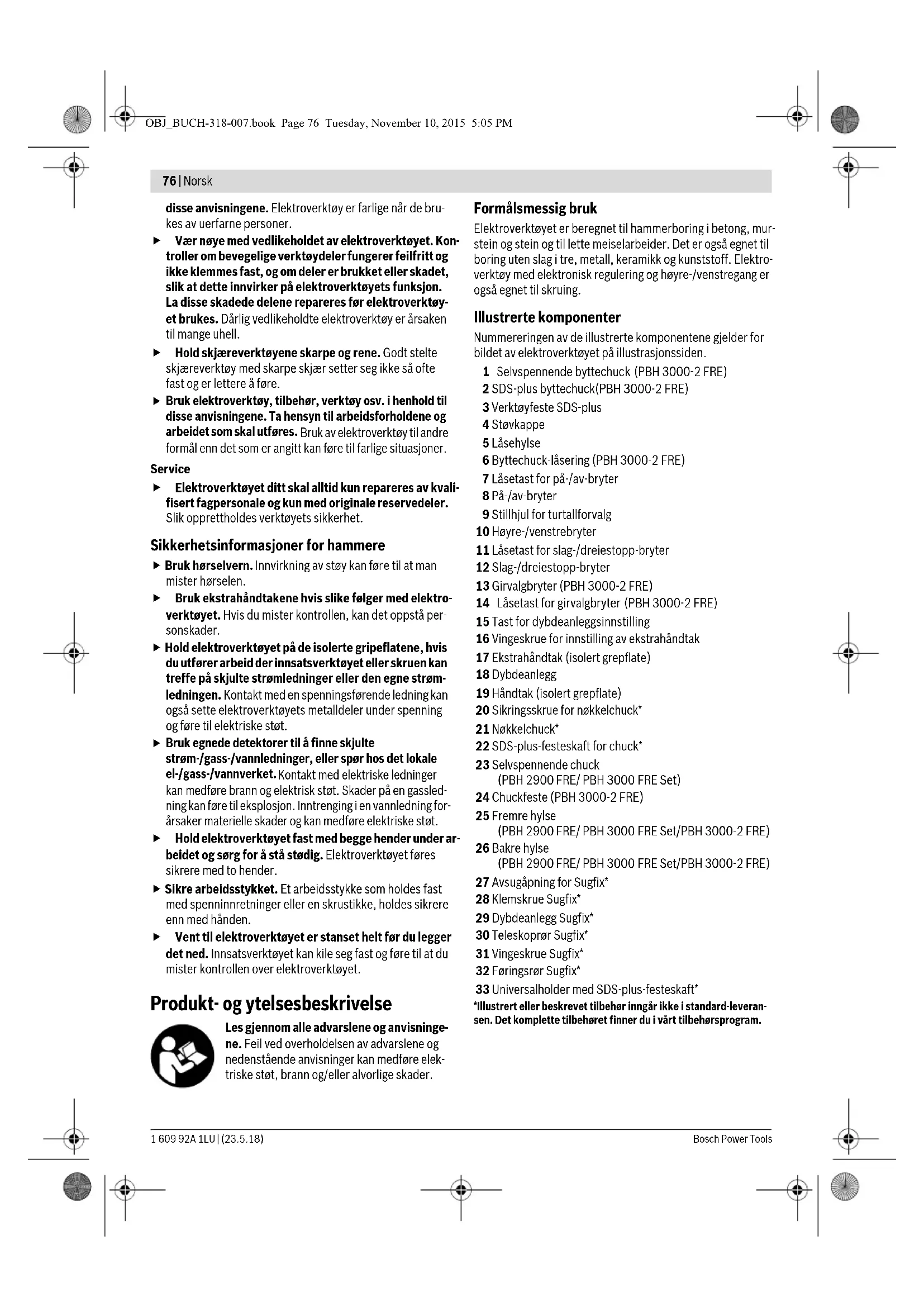 Bruk egnede detektorer til å finne skjulte strøm-/gass-/vannledninger, eller spør hos det lokale el-/gass-/vannverket. Kontakt med elektriske ledninger kan medføre brann og elektrisk støt. Skader på en gassled- ning kan føre til eksplosjon. Inntrenging i en vannledning for- årsaker materielle skader og kan medføre elektriske støt. Hold elektroverktøyet fast med begge hender under ar- beidet og sørg for å stå stødig. Elektroverktøyet føres sikrere med to hender. Sikre arbeidsstykket. Et arbeidsstykke som holdes fast med spenninnretninger eller en skrustikke, holdes sikrere enn med hånden. Vent til elektroverktøyet er stanset helt før du legger det ned. Innsatsverktøyet kan kile seg fast og føre til at du mister kontrollen over elektroverktøyet. Produkt- og ytelsesbeskrivelse Les gjennom alle advarslene og anvisninge- ne. Feil ved overholdelsen av advarslene og nedenstående anvisninger kan medføre elek- triske støt, brann og/eller alvorlige skader. Formålsmessig bruk Elektroverktøyet er beregnet til hammerboring i betong, mur- stein og stein og til lette meiselarbeider. Det er også egnet til boring uten slag i tre, metall, keramikk og kunststoff. Elektro- verktøy med elektronisk regulering og høyre-/venstregang er også egnet til skruing. Illustrerte komponenter Nummereringen av de illustrerte komponentene gjelder for bildet av elektroverktøyet på illustrasjonssiden. 1 Selvspennende byttechuck (PBH 3000-2 FRE) 2 SDS-plus byttechuck(PBH 3000-2 FRE) 3 Verktøyfeste SDS-plus 4 Støvkappe 5 Låsehylse 6 Byttechuck-låsering (PBH 3000-2 FRE) 7 Låsetast for på-/av-bryter 8 På-/av-bryter 9 Stillhjul for turtallforvalg 10 Høyre-/venstrebryter 11 Låsetast for slag-/dreiestopp-bryter 12 Slag-/dreiestopp-bryter 13 Girvalgbryter (PBH 3000-2 FRE) 14 Låsetast for girvalgbryter (PBH 3000-2 FRE) 15 Tast for dybdeanleggsinnstilling 16 Vingeskrue for innstilling av ekstrahåndtak 17 Ekstrahåndtak (isolert grepflate) 18 Dybdeanlegg 19 Håndtak (isolert grepflate) 20 Sikringsskrue for nøkkelchuck* 21 Nøkkelchuck* 22 SDS-plus-festeskaft for chuck* 23 Selvspennende chuck (PBH 2900 FRE/ PBH 3000 FRE Set) 24 Chuckfeste (PBH 3000-2 FRE) 25 Fremre hylse (PBH 2900 FRE/ PBH 3000 FRE Set/PBH 3000-2 FRE) 26 Bakre hylse (PBH 2900 FRE/ PBH 3000 FRE Set/PBH 3000-2 FRE) 27 Avsugåpning for Sugfix* 28 Klemskrue Sugfix* 29 Dybdeanlegg Sugfix* 30 Teleskoprør Sugfix* 31 Vingeskrue Sugfix* 32 Føringsrør Sugfix* 33 Universalholder med SDS-plus-festeskaft* *Illustrert eller beskrevet tilbehør inngår ikke i standard-leveran- sen. Det komplette tilbehøret finner du i vårt tilbehørsprogram. OBJ_BUCH-318-007.book Page 76 Tuesday, November 10, 2015 5:05 PMNorsk | 77 Bosch Power Tools 1 609 92A 1LU | (23.5.18) Tekniske data Støy-/vibrasjonsinformasjon Måleverdier for lyden funnet i henhold til EN 60745. Elektroverktøyets typiske A-bedømte støynivå er: Lydtrykkni- vå 89 dB(A); lydeffektnivå 100 dB(A). Usikkerhet K =3 dB. Bruk hørselvern!