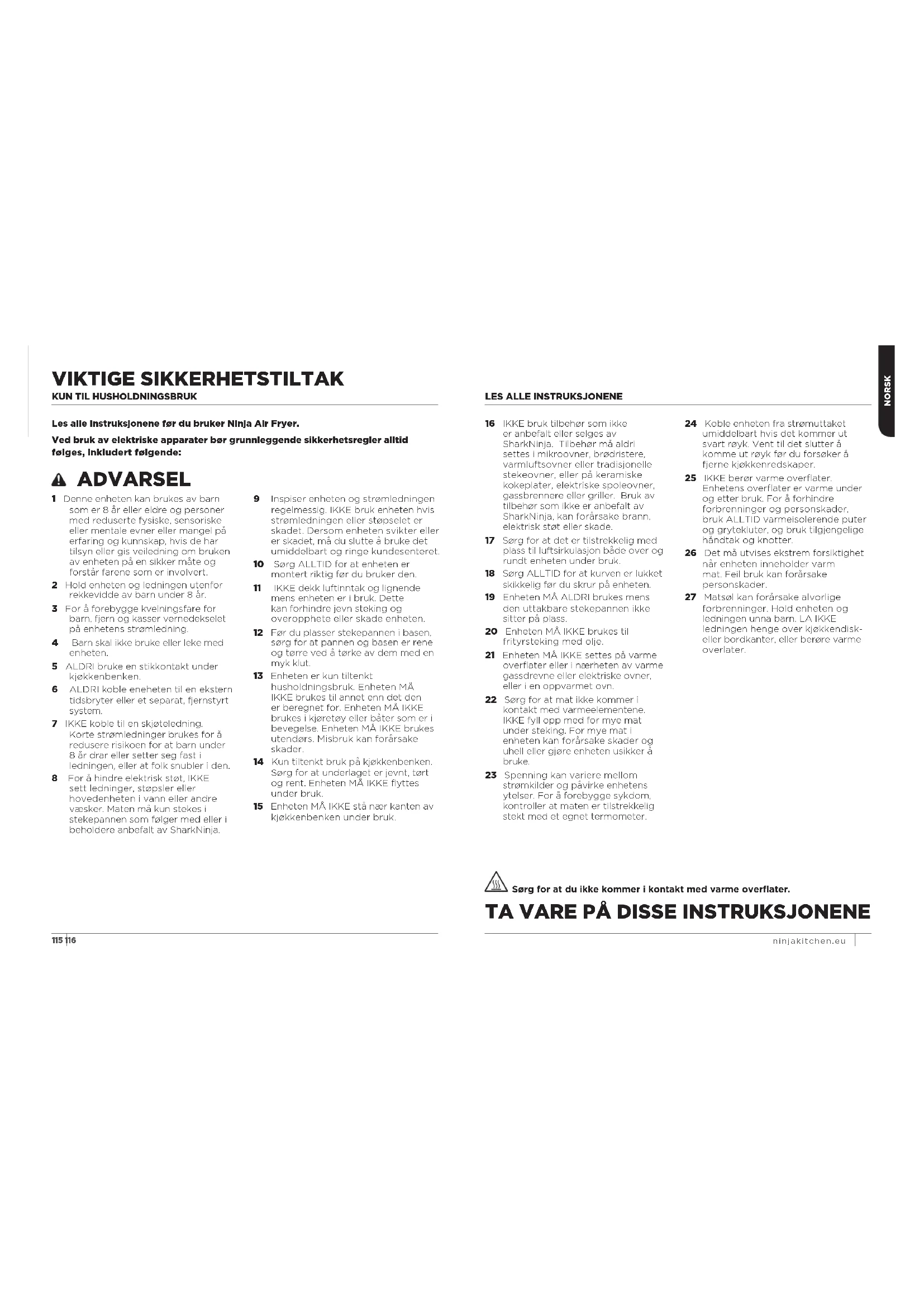 Sørg for at du ikke kommer i kontakt med varme overflater. 16 IKKE bruk tilbehør som ikke er anbefalt eller selges av SharkNinja. Tilbehør må aldri settes i mikroovner, brødristere, varmluftsovner eller tradisjonelle stekeovner, eller på keramiske kokeplater, elektriske spoleovner, gassbrennere eller griller. Bruk av tilbehør som ikke er anbefalt av SharkNinja, kan forårsake brann, elektrisk støt eller skade. 17 Sørg for at det er tilstrekkelig med plass til luftsirkulasjon både over og rundt enheten under bruk. 18 Sørg ALLTID for at kurven er lukket skikkelig før du skrur på enheten. 19 Enheten MÅ ALDRI brukes mens den uttakbare stekepannen ikke sitter på plass. 20 Enheten MÅ IKKE brukes til frityrsteking med olje. 21 Enheten MÅ IKKE settes på varme overflater eller i nærheten av varme gassdrevne eller elektriske ovner, eller i en oppvarmet ovn. 22 Sørg for at mat ikke kommer i kontakt med varmeelementene. IKKE fyll opp med for mye mat under steking. For mye mat i enheten kan forårsake skader og uhell eller gjøre enheten usikker å bruke. 23 Spenning kan variere mellom strømkilder og påvirke enhetens ytelser. For å forebygge sykdom, kontroller at maten er tilstrekkelig stekt med et egnet termometer. 24 Koble enheten fra strømuttaket umiddelbart hvis det kommer ut svart røyk. Vent til det slutter å komme ut røyk før du forsøker å fjerne kjøkkenredskaper. 25 IKKE berør varme overflater. Enhetens overflater er varme under og etter bruk. For å forhindre forbrenninger og personskader, bruk ALLTID varmeisolerende puter og grytekluter, og bruk tilgjengelige håndtak og knotter. 26 Det må utvises ekstrem forsiktighet når enheten inneholder varm mat. Feil bruk kan forårsake personskader. 27 Matsøl kan forårsake alvorlige forbrenninger. Hold enheten og ledningen unna barn. LA IKKE ledningen henge over kjøkkendisk- eller bordkanter, eller berøre varme overlater. VIKTIGE SIKKERHETSTILTAK