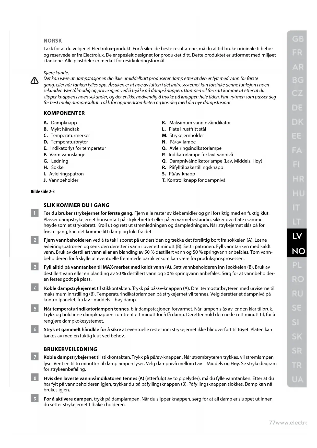 NORSK Takk for at du velger et Electrolux-produkt. For å sikre de beste resultatene, må du alltid bruke originale tilbehør og reservedeler fra Electrolux. De er spesielt designet for produktet ditt. Dette produktet er utformet med miljøet i tankene. Alle plastdeler er merket for resirkuleringsformål. Kjære kunde, Det kan være at dampstasjonen din ikke umiddelbart produserer damp etter at den er fylt med vann for første gang, eller når tanken fylles opp. Årsaken er at noe av luften i det indre systemet kan forsinke denne funksjon i noen sekunder. Vær tålmodig og prøve igjen ved å trykke på damp-knappen. Dampen vil fortsatt komme ut etter at du slipper knappen i noen sekunder, og det er ikke nødvendig å trykke på knappen hele tiden. Finn rytmen som passer deg for best mulig dampresultat. Takk for oppmerksomheten og kos deg med din nye dampstasjon! KOMPONENTER A. Dampknapp B. Mykt håndtak C. Temperaturmerker D. Temperaturbryter E. Indikatorlys for temperatur F. Varm vannslange G. Ledning H. Sokkel І. Avleiringspatron J. Vannbeholder K. Maksimum vanninvåindikator L. Plate i rustfritt stål M. Strykejernholder N. På/av-lampe O. Avleiringsindikatorlampe P. Indikatorlampe for lavt vannivå Q. Dampnivåindikatorlampe (Lav, Middels, Høy) R. Påfylltilbakestillingsknapp S. På/av-knapp T. Kontrollknapp for dampnivå Bilde side 2-3