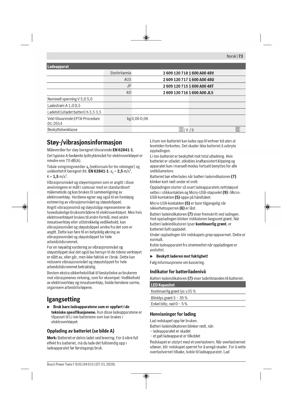 2 609 120 716 1 600 A00 JL5 Nominell spenning V 5,0 5,0 Ladestrøm A 1,0 0,5 Ladetid (utladet batteri) h 3,5 3,5 Vekt tilsvarende EPTA‑Procedure 01:2014 kg 0,06 0,06 Beskyttelsesklasse / II / II Støy-/vibrasjonsinformasjon Måleverdier for støy beregnet tilsvarende EN62841-1. Det typiske A-bedømte lydtrykknivået for elektroverktøyet er mindre enn 70dB(A). Totale svingningsverdier a
