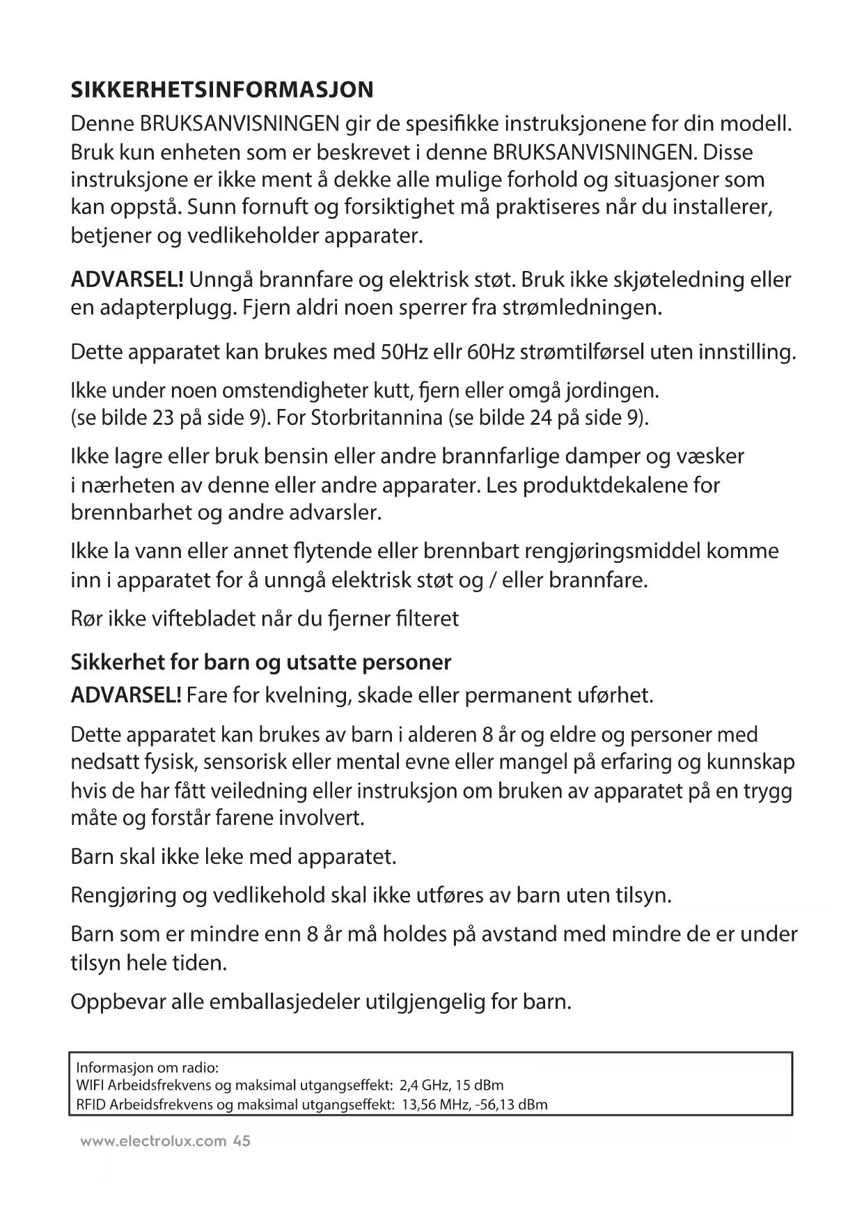 CSwww.electrolux.com 45 SIKKERHETSINFORMASJON Denne BRUKSANVISNINGEN gir de spesikke instruksjonene for din modell. Bruk kun enheten som er beskrevet i denne BRUKSANVISNINGEN. Disse instruksjone er ikke ment å dekke alle mulige forhold og situasjoner som kan oppstå. Sunn fornuft og forsiktighet må praktiseres når du installerer, betjener og vedlikeholder apparater. ADVARSEL! Unngå brannfare og elektrisk støt. Bruk ikke skjøteledning eller en adapterplugg. Fjern aldri noen sperrer fra strømledningen. Dette apparatet kan brukes med 50Hz ellr 60Hz strømtilførsel uten innstilling. Ikke under noen omstendigheter kutt, ern eller omgå jordingen. (se bilde 23 på side 9). For Storbritannina (se bilde 24 på side 9). Ikke lagre eller bruk bensin eller andre brannfarlige damper og væsker i nærheten av denne eller andre apparater. Les produktdekalene for brennbarhet og andre advarsler. Ikke la vann eller annet ytende eller brennbart rengjøringsmiddel komme inn i apparatet for å unngå elektrisk støt og / eller brannfare. Rør ikke viftebladet når du erner lteret Sikkerhet for barn og utsatte personer ADVARSEL! Fare for kvelning, skade eller permanent uførhet. Dette apparatet kan brukes av barn i alderen 8 år og eldre og personer med nedsatt fysisk, sensorisk eller mental evne eller mangel på erfaring og kunnskap hvis de har fått veiledning eller instruksjon om bruken av apparatet på en trygg måte og forstår farene involvert. Barn skal ikke leke med apparatet. Rengjøring og vedlikehold skal ikke utføres av barn uten tilsyn. Barn som er mindre enn 8 år må holdes på avstand med mindre de er under tilsyn hele tiden. Oppbevar alle emballasjedeler utilgjengelig for barn. Informasjon om radio: WIFI Arbeidsfrekvens og maksimal utgangseffekt: 2,4 GHz, 15 dBm RFID Arbeidsfrekvens og maksimal utgangseffekt: 13,56 MHz, -56,13 dBmwww.electrolux.com46 Elektrisk montering ADVARSEL! Unngå brannfare og elektrisk støt Hvis du ikke er sikker på at stikkontakten er tilstrekkelig jordet eller beskyttet med en treg sikring eller strømbryter, må du installere en egnet stikkontakt i henhold til de gjeldende lokale elektriske forskrifter og bestemmelser. Bruk ikke en skjøteledning eller en adapterplugg. Trekk aldri ut støpslet med strømledningen. Ta alltid et godt grep på støpslet og trekk den rett ut av stikkontakten. Klyp, bøy eller knyt aldri strømledningen. Du må aldri kutte eller skade strømledningen. Hvis strømledningen er skadet må den kun byttes ut av en autorisert Electrolux serviceperson. Denne enheten inneholder ingen deler som kan repareres av brukeren. Tillkall alltid en autorisert serviceperson fra Electrolux. Dersom strømforsyningskabelen er skadet, må den skiftes av produsenten, serviceagenten eller et autorisert serviceverksted for å unngå fare. Sørg for at du trekker ut strømkontakten til enheten før rengjøringen slik at du unngår risiko for støt eller brann. Sikkerhetsmessige forholdsregler FORSIKTIGHET! Unngå alvorlig skade eller dødsfall. Stikk ikke ngre eller gjenstander i luftutslippsområdet eller frontgitteret på enheten. Ikke start eller stopp enheten ved å trekke ut strømledningen eller slå av strømmen i sikringsskapet. Ved funksjonsfeil (gnister, brennende lukt osv.), må apparatet umiddelbart slås av, koble fra strømledningen og ringe en autorisert Electrolux serviceperson. Ikke betjen enheten med våte hender. Trekk ikke i strømledningen. FORSIKTIG! Unngå personskade eller skade på enhten eller annen eiendom. Ikke led luftstrømmen mot peis eller andre varme relaterte kilder, da dette kan forårsake at ild ammer opp. Du må ikke klatre eller plassere ting på enheten. Heng ikke ting på enheten. Plasser ikke væskebeholdere på enheten. Slå av strømtilførselen når den ikke skal brukes over et lengre tidsrom. Bruk enheten med lteret på plass. Ikke blokkér eller dekk inntaksgitteret, utblåsingsområdet og utløpsportene. AVHENDING Dette symbolet på produktet eller på emballasjen indikerer at produktet ikke kan behandles som husholdningsavfall. NORSK Takk igjen for at du velger PURE A9 40/PURE A9 60 luftrenser fra Electrolux. Bruk alltid originalt tilbehør og reservedeler for å oppnå de beste resultatene. Dette produktet er utviklet med tanke på miljøet. Alle plastdeler er merket for gjenvinningsformål.