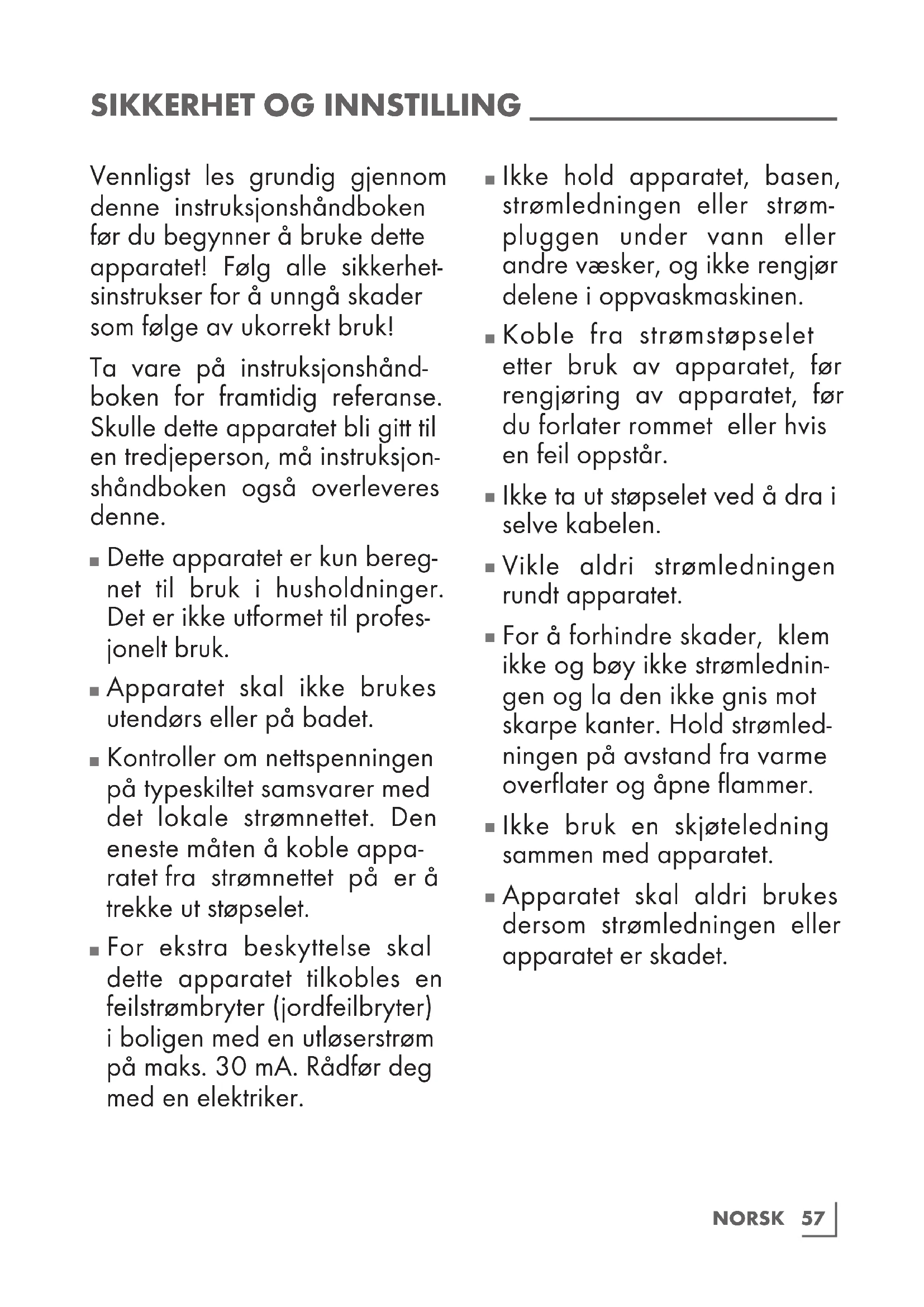 Apparatet skal aldri brukes dersom strømledningen eller apparatet er skadet.58 NORSK