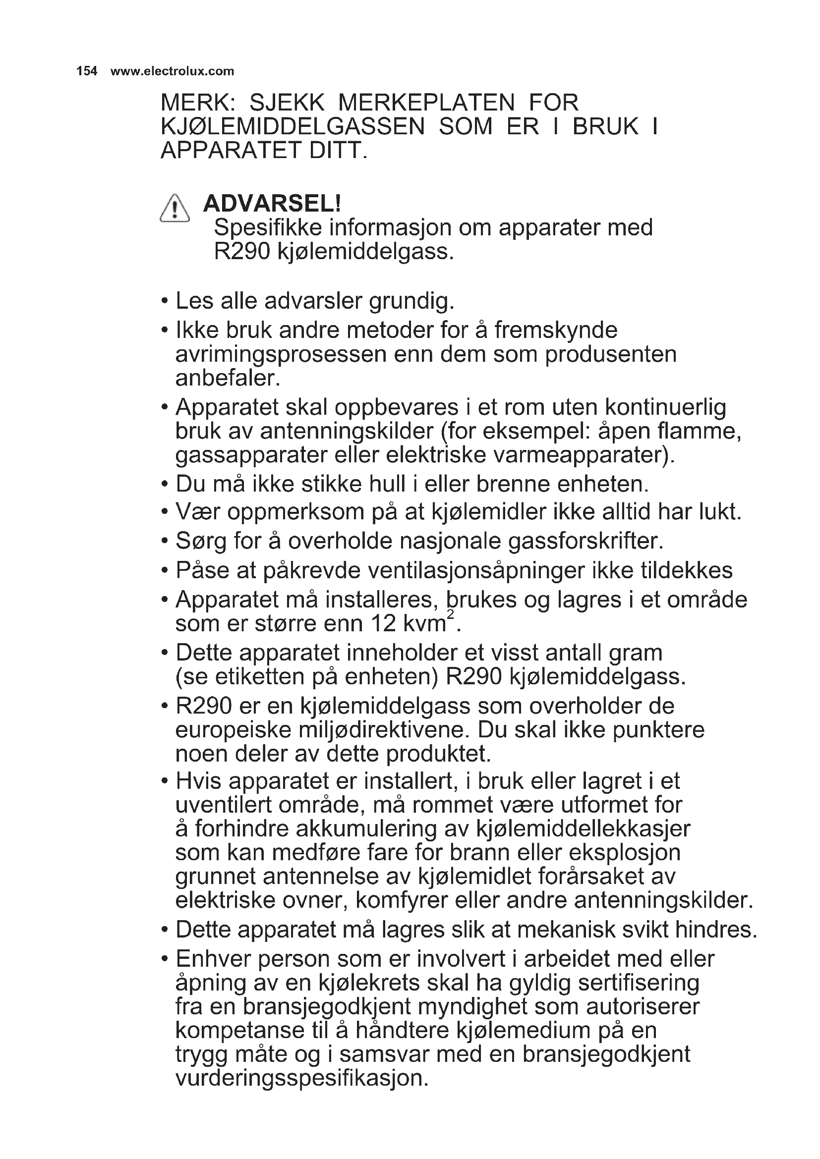 R290 er en kjølemiddelgass som overholder de europeiske miljødirektivene. Du skal ikke punktere noen deler av detteproduktet. - Hvis apparatet er installer, i bruk eller lagret i et uventilert område, mA rommet ære utformet for Å forhindre akkumulering av kjølemiddellekkasjer som kan medføre fare for brann eller eksplosjon grunnet antennelse av kjølemidlet forårsaket av elektriske ovner, komfyrer erller andre antenningskilder.