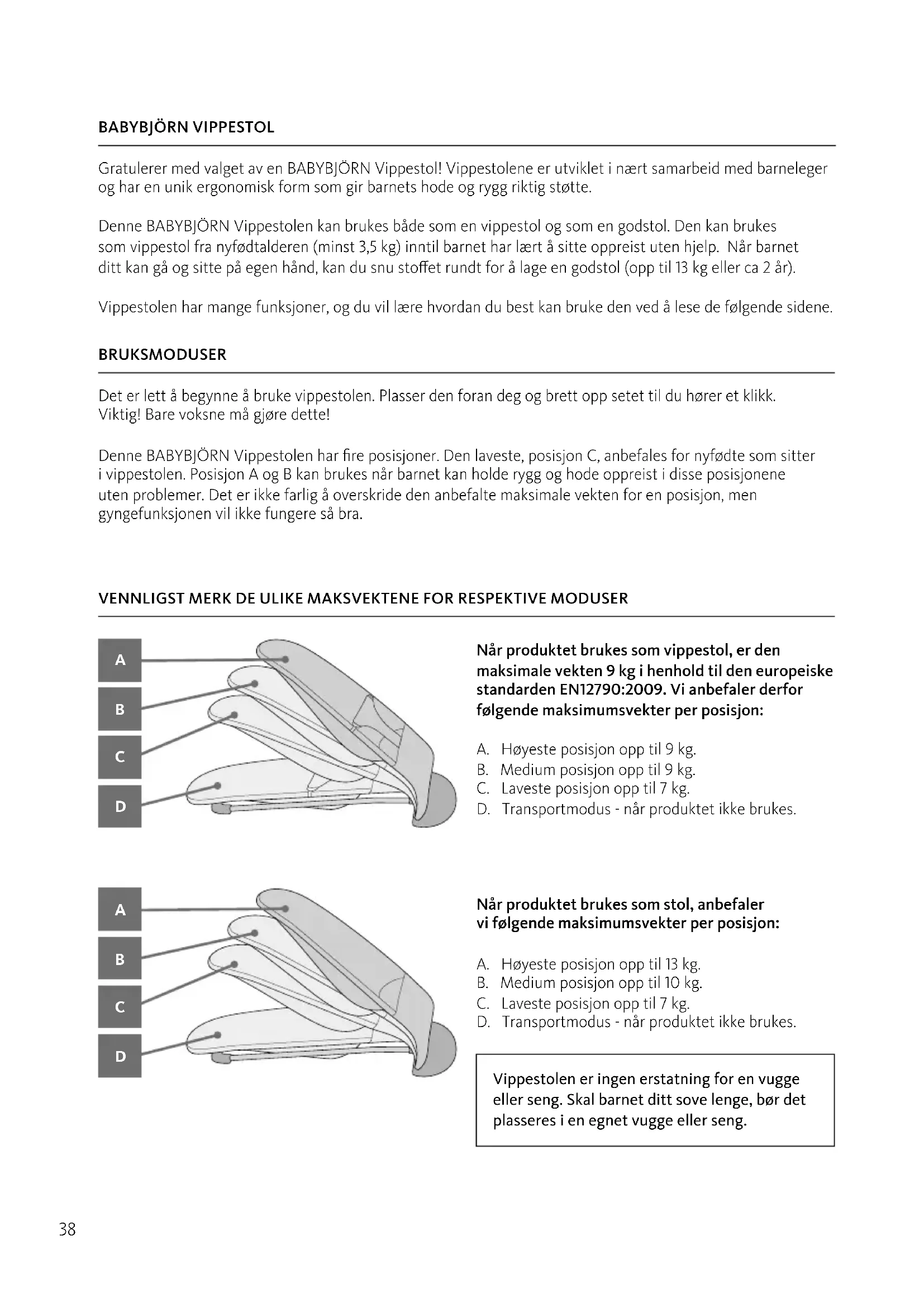 Gratulerer med valget av en BABYBJÖRN Vippestol! Vippestolene er utviklet i nært samarbeid med barneleger og har en unik ergonomisk form som gir barnets hode og rygg riktig støtte. Denne BABYBJÖRN Vippestolen kan brukes både som en vippestol og som en godstol. Den kan brukes som vippestol fra nyfødtalderen (minst 3,5 kg) inntil barnet har lært å sitte oppreist uten hjelp. Når barnet ditt kan gå og sitte på egen hånd, kan du snu stoet rundt for å lage en godstol (opp til 13 kg eller ca 2 år). Vippestolen har mange funksjoner, og du vil lære hvordan du best kan bruke den ved å lese de følgende sidene. Når produktet brukes som vippestol, er den maksimale vekten 9 kg i henhold til den europeiske standarden EN12790:2009. Vi anbefaler derfor følgende maksimumsvekter per posisjon: A. Høyeste posisjon opp til 9 kg. B. Medium posisjon opp til 9 kg. C. Laveste posisjon opp til 7 kg. D. Transportmodus - når produktet ikke brukes. VENNLIGST MERK DE ULIKE MAKSVEKTENE FOR RESPEKTIVE MODUSER Når produktet brukes som stol, anbefaler vi følgende maksimumsvekter per posisjon: A. Høyeste posisjon opp til 13 kg. B. Medium posisjon opp til 10 kg. C. Laveste posisjon opp til 7 kg. D. Transportmodus - når produktet ikke brukes. BRUKSMODUSER Det er lett å begynne å bruke vippestolen. Plasser den foran deg og brett opp setet til du hører et klikk. Viktig! Bare voksne må gjøre dette! Denne BABYBJÖRN Vippestolen har fire posisjoner. Den laveste, posisjon C, anbefales for nyfødte som sitter i vippestolen. Posisjon A og B kan brukes når barnet kan holde rygg og hode oppreist i disse posisjonene uten problemer. Det er ikke farlig å overskride den anbefalte maksimale vekten for en posisjon, men gyngefunksjonen vil ikke fungere så bra. Vippestolen er ingen erstatning for en vugge eller seng. Skal barnet ditt sove lenge, bør det plasseres i en egnet vugge eller seng.39