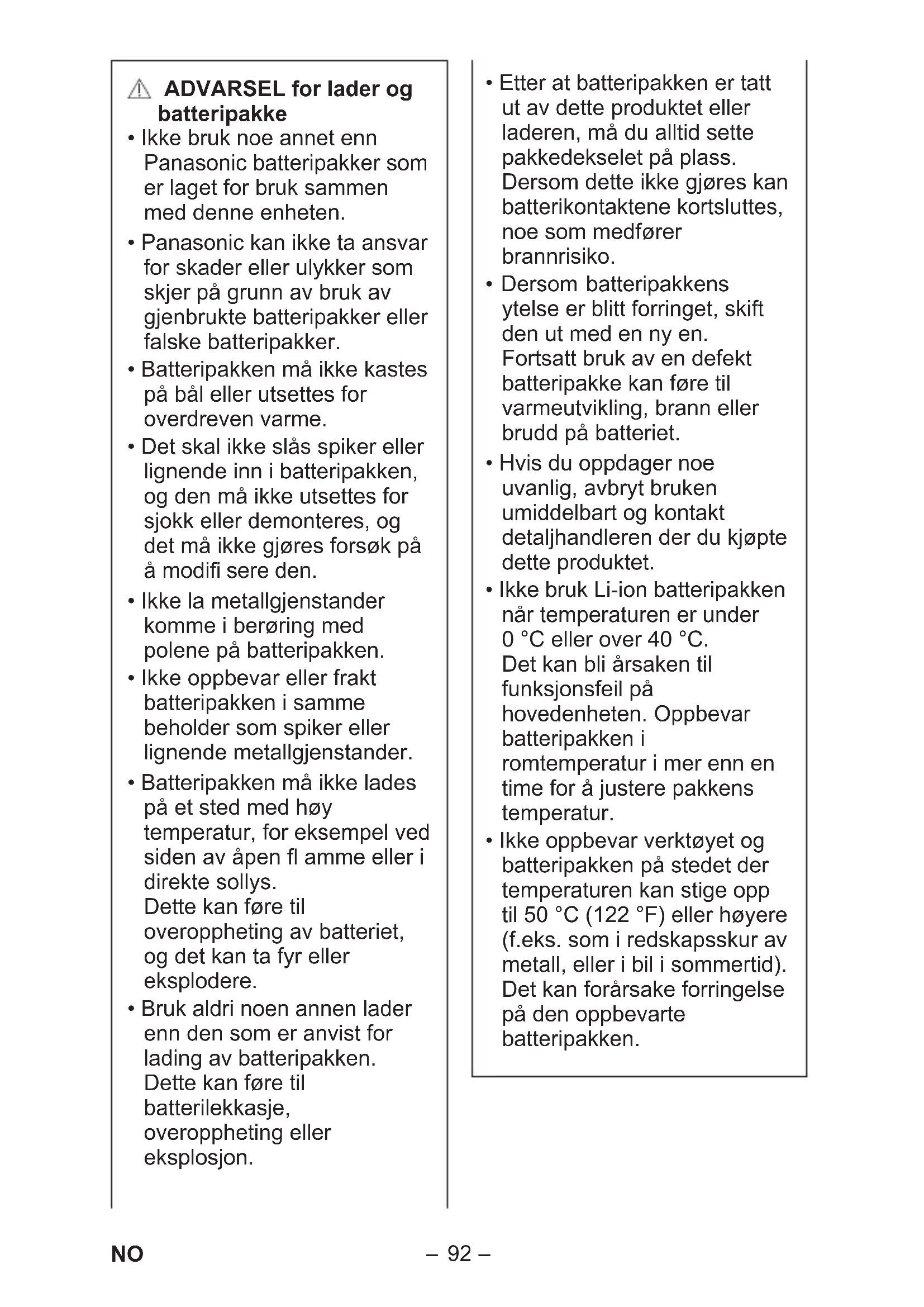 - Batteripakken må ikke kastes på bål eller utsettes for overdreven varme.
