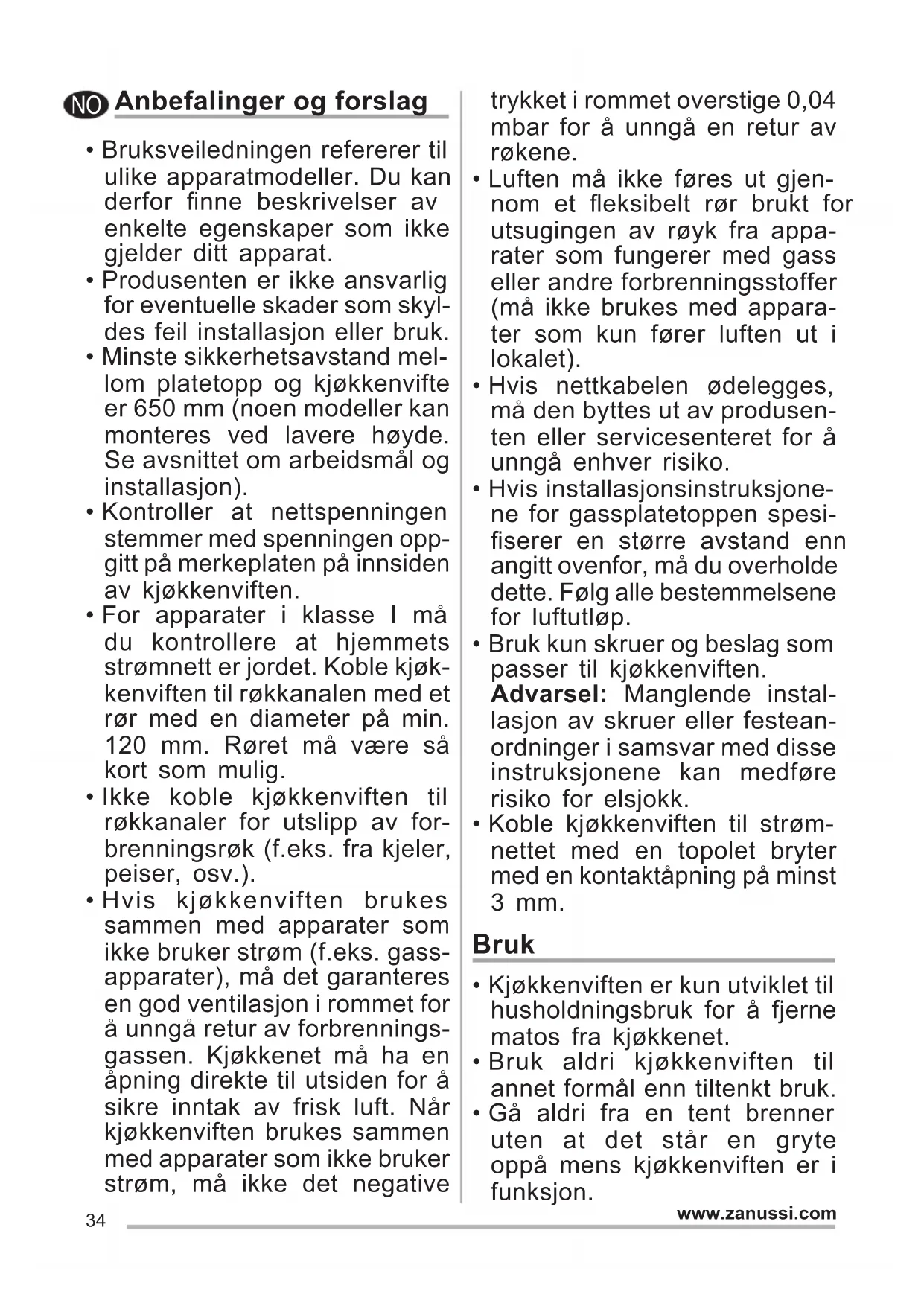 - Gå aldri fra en tent brenner uten at det står en gryte oppå mens kjøkkenviften er i funksjon. NO35 www.zanussi.com