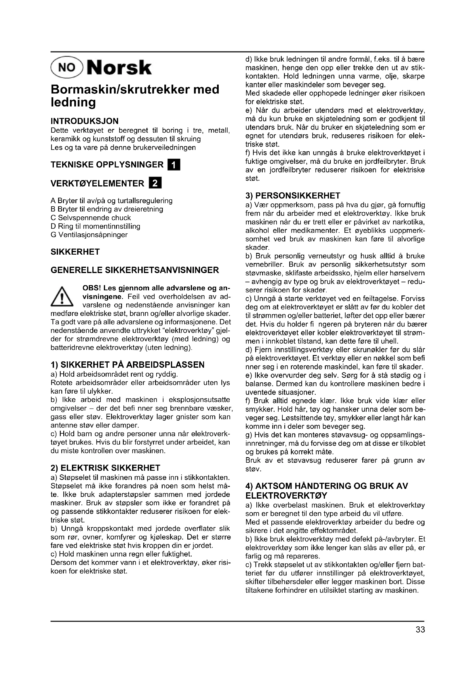 VERKTØYELEMENTER 2 A Bryter til av/på og turtallsregulering B Bryter til endring av dreieretning C Selvspennende chuck D Ring til momentinnstilling G Ventilasjonsåpninger SIKKERHET GENERELLE SIKKERHETSANVISNINGER OBS! Les gjennom alle advarslene og an- visningene. Feil ved overholdelsen av ad- varslene og nedenstående anvisninger kan medføre elektriske støt, brann og/eller alvorlige skader. Ta godt vare på alle advarslene og informasjonene. Det nedenstående anvendte uttrykket “elektroverktøy” gjel- der for strømdrevne elektroverktøy (med ledning) og batteridrevne elektroverktøy (uten ledning).