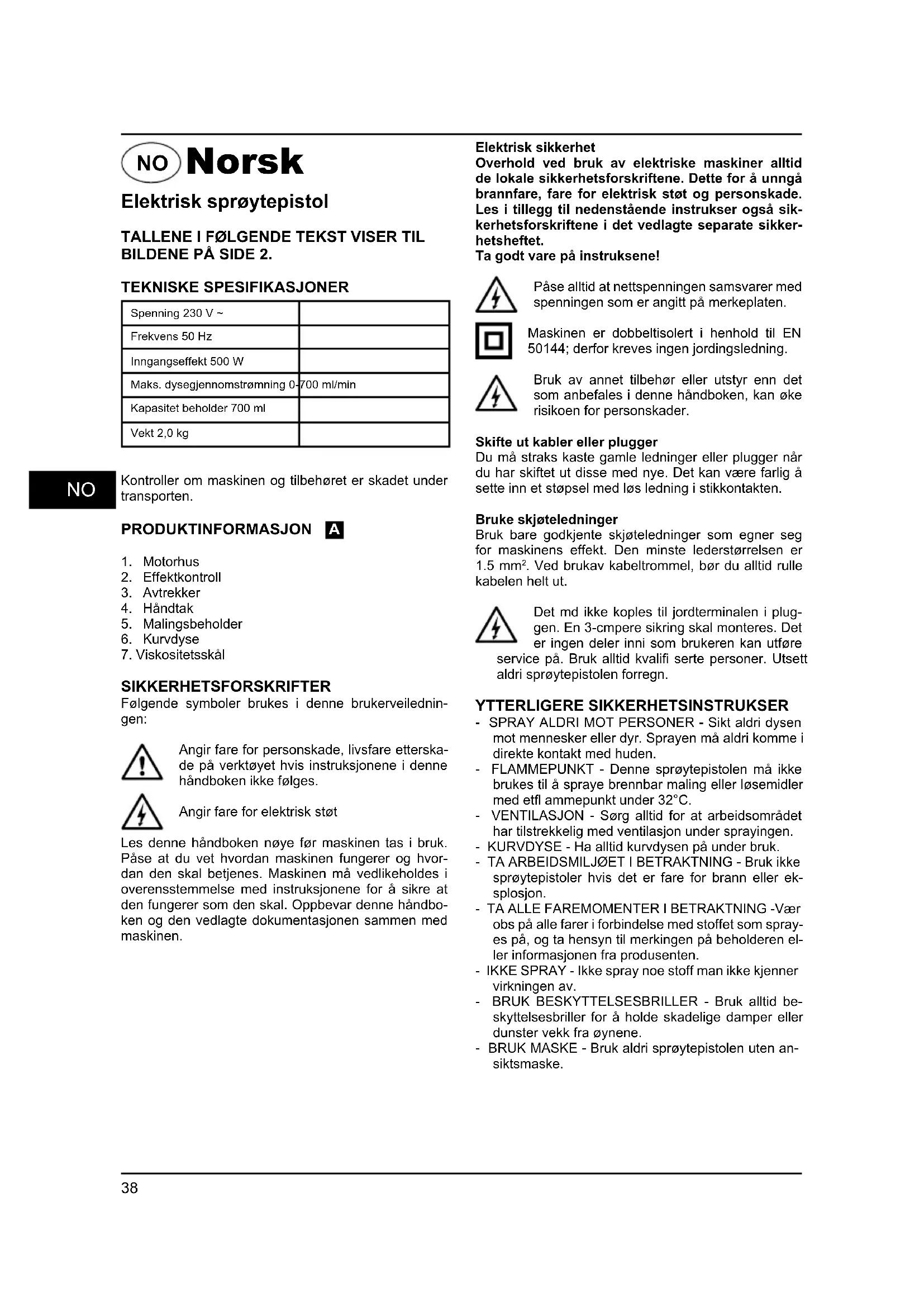 Overhold ved bruk av elektriske maskiner alltid de lokale sikkerhetsforskriftene. Dette for a unnga brannfare, fare for elektrisk stot og personskade. Les i tillegg til nedenstaende instrukser ogsa sikkerhetsforskriftene i det vedlagte separate sikkerhetsheftet.