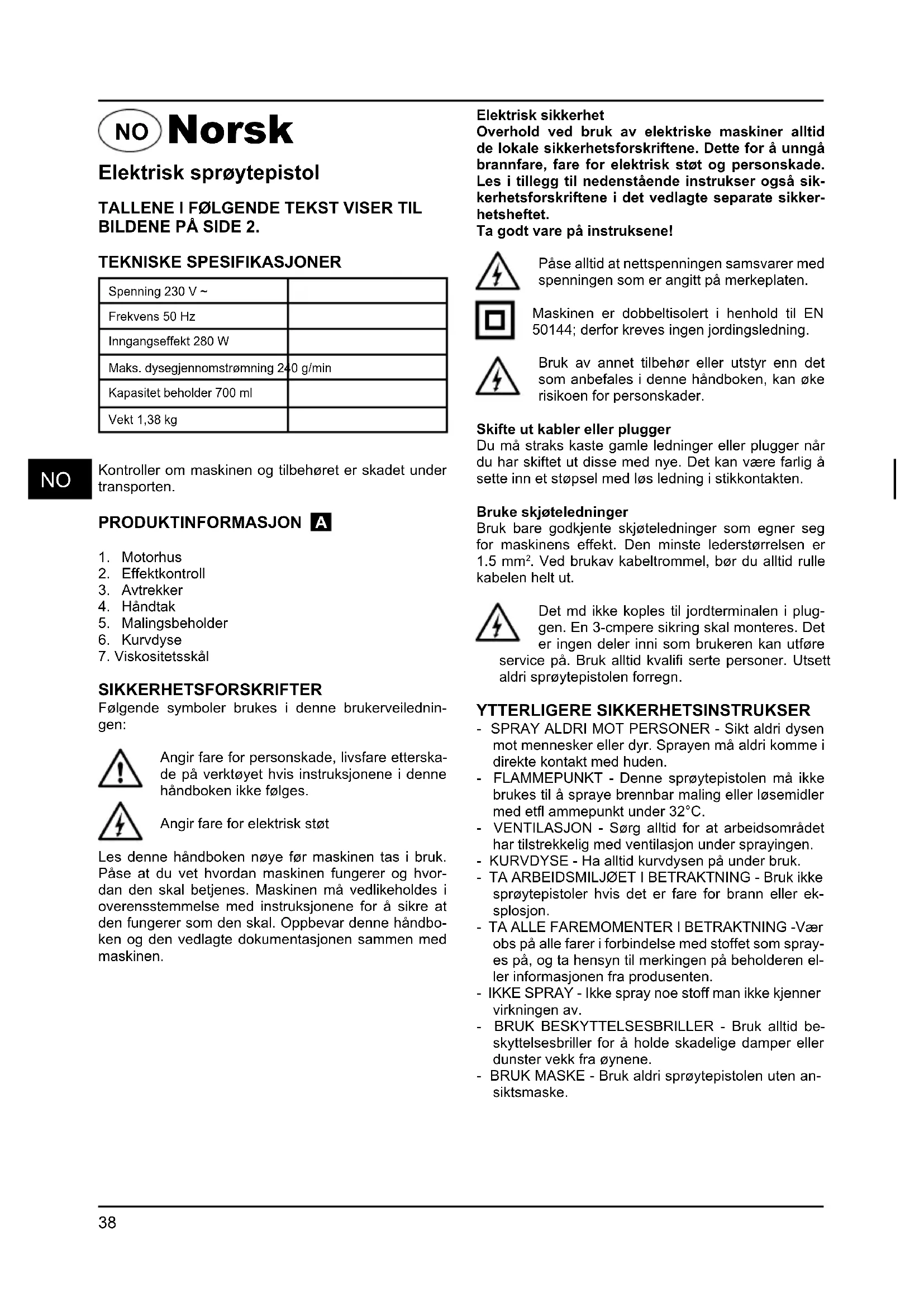 . Ved brukav kabeltrommel, bør du alltid rulle kabelen helt ut. Det md ikke koples til jordterminalen i plug- gen. En 3-cmpere sikring skal monteres. Det er ingen deler inni som brukeren kan utføre service på. Bruk alltid kvalifi serte personer. Utsett aldri sprøytepistolen forregn. YTTERLIGERE SIKKERHETSINSTRUKSER - SPRAY ALDRI MOT PERSONER - Sikt aldri dysen mot mennesker eller dyr. Sprayen må aldri komme i direkte kontakt med huden. - FLAMMEPUNKT - Denne sprøytepistolen må ikke brukes til å spraye brennbar maling eller løsemidler med etfl ammepunkt under 32°C. - VENTILASJON - Sørg alltid for at arbeidsområdet har tilstrekkelig med ventilasjon under sprayingen. - KURVDYSE - Ha alltid kurvdysen på under bruk. - TA ARBEIDSMILJØET I BETRAKTNING - Bruk ikke sprøytepistoler hvis det er fare for brann eller ek- splosjon. - TA ALLE FAREMOMENTER I BETRAKTNING -Vær obs på alle farer i forbindelse med stoffet som spray- es på, og ta hensyn til merkingen på beholderen el- ler informasjonen fra produsenten. - IKKE SPRAY - Ikke spray noe stoff man ikke kjenner virkningen av. - BRUK BESKYTTELSESBRILLER - Bruk alltid be- skyttelsesbriller for å holde skadelige damper eller dunster vekk fra øynene. - BRUK MASKE - Bruk aldri sprøytepistolen uten an- siktsmaske.