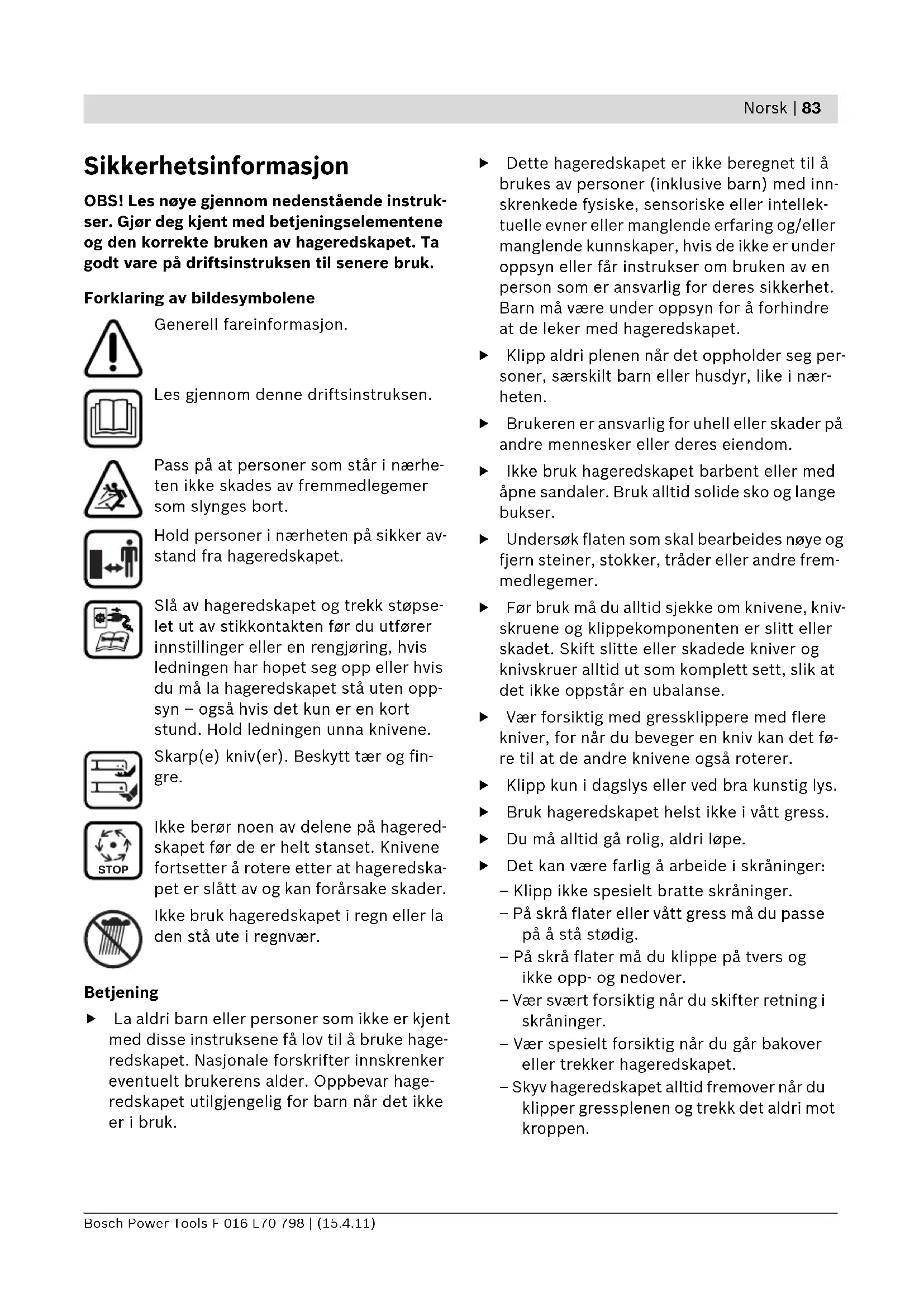 Sikkerhetsinformasjon OBS! Les nøye gjennom nedenstående instruk- ser. Gjør deg kjent med betjeningselementene og den korrekte bruken av hageredskapet. Ta godt vare på driftsinstruksen til senere bruk. Forklaring av bildesymbolene Generell fareinformasjon. Les gjennom denne driftsinstruksen. Pass på at personer som står i nærhe- ten ikke skades av fremmedlegemer som slynges bort. Hold personer i nærheten på sikker av- stand fra hageredskapet. Slå av hageredskapet og trekk støpse- let ut av stikkontakten før du utfører innstillinger eller en rengjøring, hvis ledningen har hopet seg opp eller hvis du må la hageredskapet stå uten opp- syn – også hvis det kun er en kort stund. Hold ledningen unna knivene. Skarp(e) kniv(er). Beskytt tær og fin- gre. Ikke berør noen av delene på hagered- skapet før de er helt stanset. Knivene fortsetter å rotere etter at hageredska- pet er slått av og kan forårsake skader. Ikke bruk hageredskapet i regn eller la den stå ute i regnvær. Betjening f La aldri barn eller personer som ikke er kjent med disse instruksene få lov til å bruke hage- redskapet. Nasjonale forskrifter innskrenker eventuelt brukerens alder. Oppbevar hage- redskapet utilgjengelig for barn når det ikke er i bruk. f Dette hageredskapet er ikke beregnet til å brukes av personer (inklusive barn) med inn- skrenkede fysiske, sensoriske eller intellek- tuelle evner eller manglende erfaring og/eller manglende kunnskaper, hvis de ikke er under oppsyn eller får instrukser om bruken av en person som er ansvarlig for deres sikkerhet. Barn må være under oppsyn for å forhindre at de leker med hageredskapet. f Klipp aldri plenen når det oppholder seg per- soner, særskilt barn eller husdyr, like i nær- heten. f Brukeren er ansvarlig for uhell eller skader på andre mennesker eller deres eiendom. f Ikke bruk hageredskapet barbent eller med åpne sandaler. Bruk alltid solide sko og lange bukser. f Undersøk flaten som skal bearbeides nøye og fjern steiner, stokker, tråder eller andre frem- medlegemer. f Før bruk må du alltid sjekke om knivene, kniv- skruene og klippekomponenten er slitt eller skadet. Skift slitte eller skadede kniver og knivskruer alltid ut som komplett sett, slik at det ikke oppstår en ubalanse. f Vær forsiktig med gressklippere med flere kniver, for når du beveger en kniv kan det fø- re til at de andre knivene også roterer. f Klipp kun i dagslys eller ved bra kunstig lys. f Bruk hageredskapet helst ikke i vått gress. f Du må alltid gå rolig, aldri løpe. f Det kan være farlig å arbeide i skråninger: – Klipp ikke spesielt bratte skråninger. – På skrå flater eller vått gress må du passe på å stå stødig. – På skrå flater må du klippe på tvers og ikke opp- og nedover. – Vær svært forsiktig når du skifter retning i skråninger. – Vær spesielt forsiktig når du går bakover eller trekker hageredskapet. – Skyv hageredskapet alltid fremover når du klipper gressplenen og trekk det aldri mot kroppen. STOP OBJ_BUCH-1393-001.book Page 83 Friday, April 15, 2011 10:36 AM84 | Norsk F 016 L70 798 | (15.4.11) Bosch Power Tools f Knivene må stå stille når du vipper hagered- skapet til transport, når du går over flater uten gress og når du transporterer hagered- skapet til og fra området som skal klippes. f Ikke vipp hageredskapet når motoren star- tes, unntatt hvis dette er nødvendig til star- ting i høyt gress. I dette tilfellet må siden som peker bort fra brukeren ikke løftes lenger opp med håndtaket enn nødvendig. Pass på at hendene dine holder i grepet når du slip- per hageredskapet ned igjen. f Slå hageredskapet på som beskrevet i drifts- instruksen, og pass på at føttene dine er godt unna de roterende delene. f Sørg for at hender og føtter ikke kommer i nærheten av eller under roterende deler. f Hold deg på avstand til utkastsonen når du arbeider med hageredskapet. f Du må aldri løfte eller bære hageredskapet mens motoren går. f Bruk aldri hageredskapet med defekte be- skyttelsesinnretninger, deksler eller uten sik- kerhetsinnretninger, som f. eks. avbøyervern og/eller gressoppsamlerkurv. f Vær spesielt forsiktig ved innstillinger på gress- klipperen, slik at du ikke klemmer fast hender og føtter mellom de bevegelige knivene og fast- stående maskindeler på gressklipperen. f Hold strøm- og skjøteledninger unna kni- ven. Kniven kan skade ledningen og medføre at du berører spenningsførende deler. OBS! Det er fare for elektriske støt. Trekk støpselet ut av stikkontakten: – alltid når du forlater hageredskapet, – før blokkeringer fjernes, – når du sjekker, rengjør eller arbeider på ha- geredskapet, – etter kollisjon med et fremmedlegeme. Sjekk straks om hageredskapet er skadet og la det om nødvendig repareres, – hvis hageredskapet begynner å vibrere uvan- lig sterkt (må straks sjekkes). Strømtilkobling f Spenningen på strømkilden må stemme over- ens med informasjonene på typeskiltet til ha- geredskapet. f Det anbefales å kople hageredskapet kun til en stikkontakt som er sikret med en 30 mA jordfeil-bryter. f For dette hageredskapet må du kun bruke el- ler skifte ut ledninger som stemmer overens med produsentens informasjoner; bestil- lings-nr. og type se driftsinstruksen. f Ta aldri i støpselet med våte hender. f Ikke kjør over, press eller dra i strøm- eller skjøteledningen, ellers kan den ta skade. Be- skytt ledningen mot varme, olje og skarpe kanter. f Skjøteledningen må ha det tverrsnittet som er angitt i bruksanvisningen og må være vannsprutbeskyttet. Stikkforbindelsen må ikke ligge i vannet. f Bruk alltid arbeidshansker når du håndterer eller arbeider i nærheten av de skarpe knive- ne. Vedlikehold f Bruk alltid arbeidshansker når du håndterer eller arbeider i nærheten av de skarpe kni- vene. f Sørg for at alle mutre, bolter og skruer sitter godt fast, slik at hageredskapet befinner seg i en sikker arbeidstilstand. f Kontroller gressoppsa