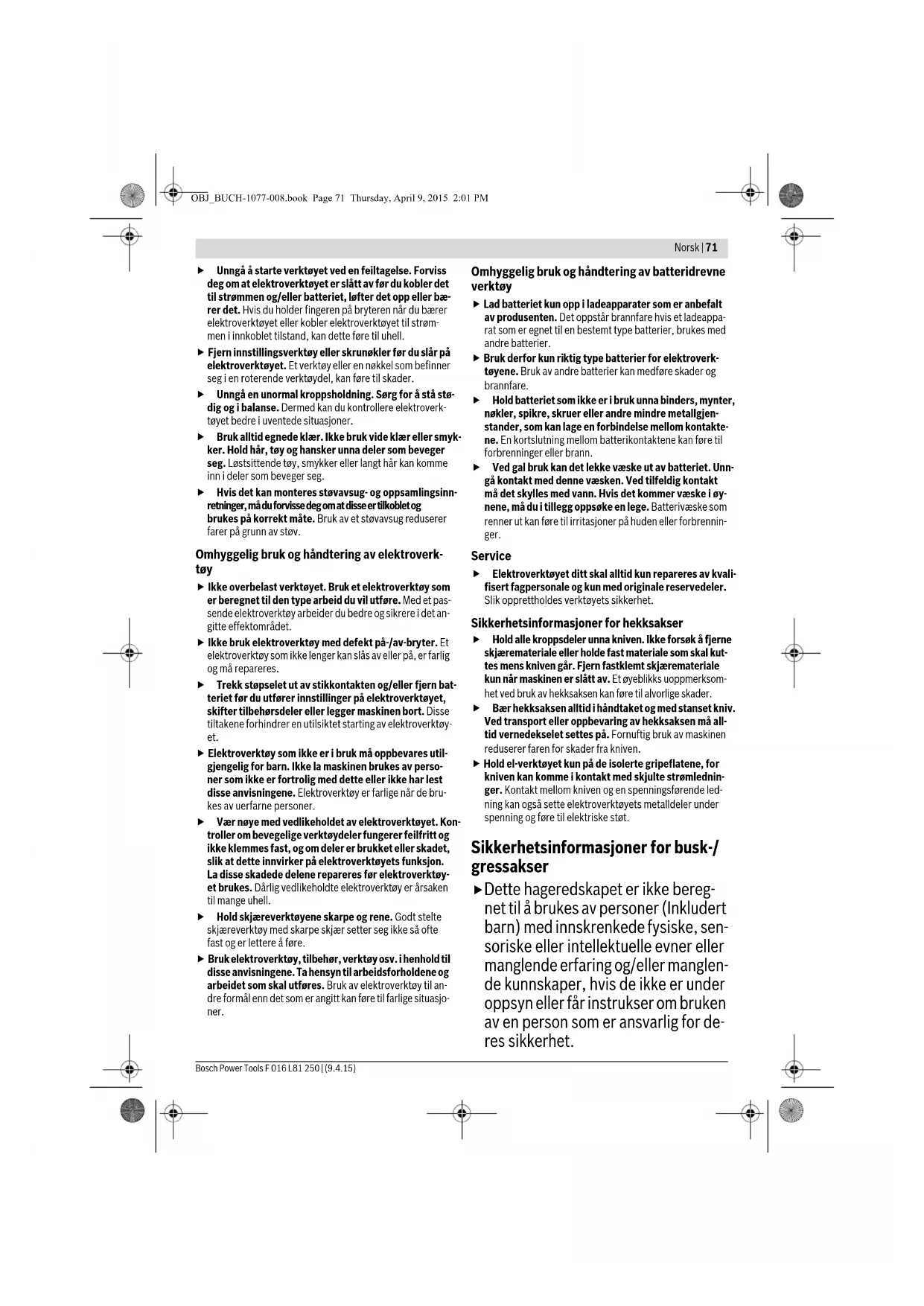 Legg merke til produktnummeret på typeskiltet til hageredskapet ditt. Handelsbetegnelsene for de enkelte hageredskapene kan variere. **gjennomsnittelig driftstid ***kun for settet «ASB 10,8 LI Set» OBJ_BUCH-1077-008.book Page 73 Thursday, April 9, 2015 2:01 PM74 | Norsk F 016 L81 250 | (9.4.15) Bosch Power Tools Støy-/vibrasjonsinformasjon Gressaks Støyutslippsverdier målt i henhold til EN 50636-2-94. Det typiske lydtrykknivået for apparatet er mindre enn 70 dB(A). Totale svingningsverdier a