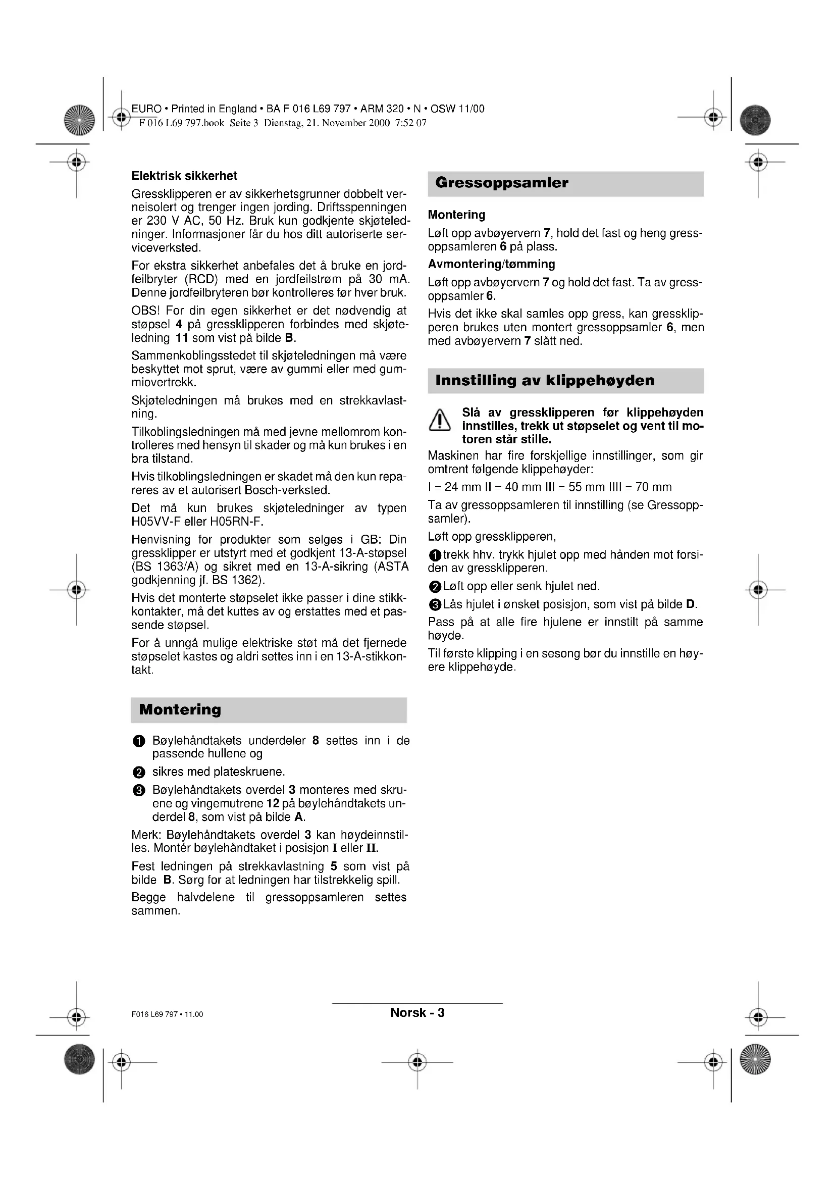Lås hjulet i ønsket posisjon, som vist på bilde D. Pass på at alle fire hjulene er innstilt på samme høyde. Til første klipping i en sesong bør du innstille en høy- ere klippehøyde. Montering Gressoppsamler Innstilling av klippehøyden F 016 L69 797.book Seite 3 Dienstag, 21. November 2000 7:52 07Norsk - 4 EURO • Printed in England • BA F 016 L69 797 • ARM 320 • N • OSW 11/00 F016 L69 797 • 11.00