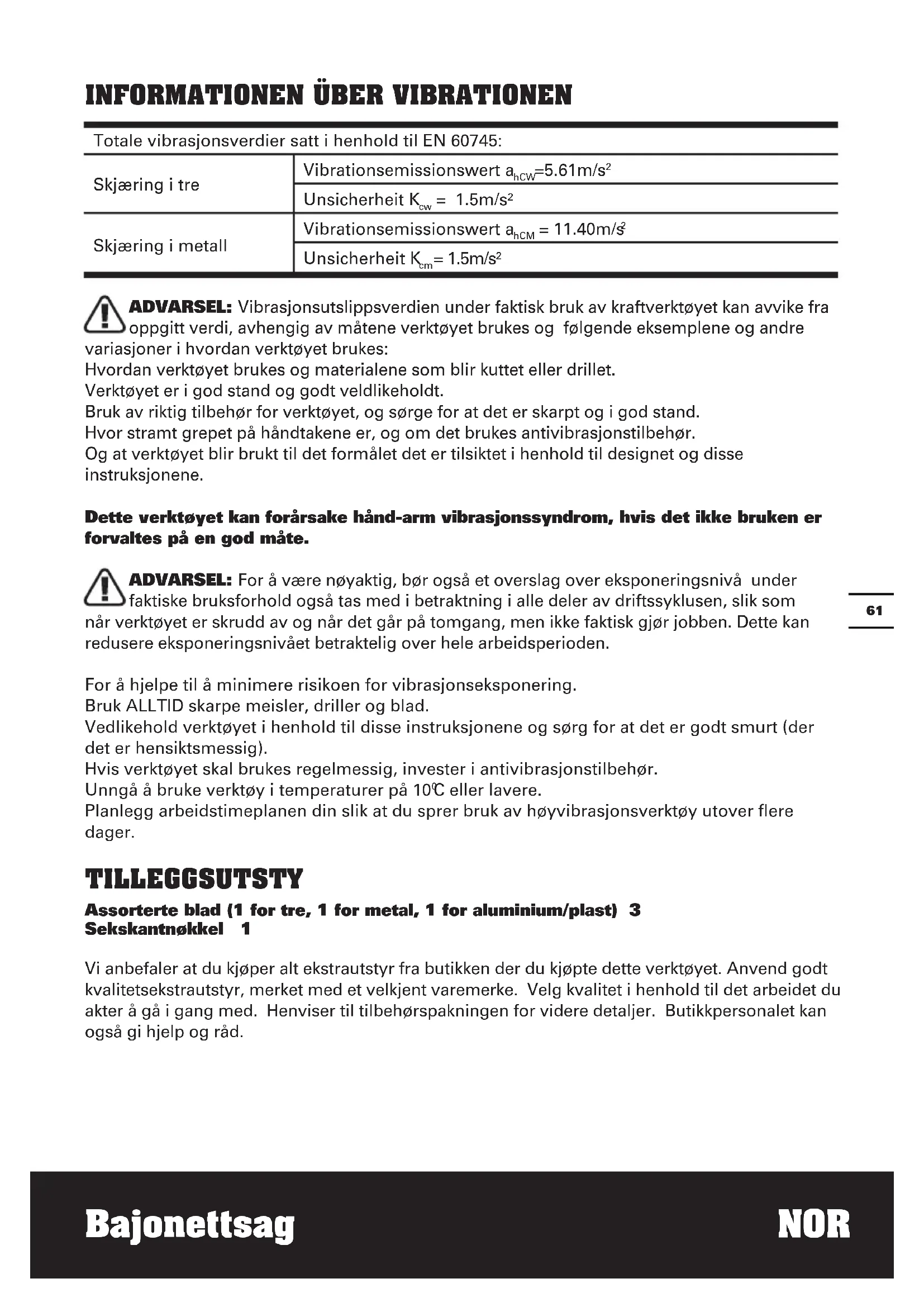 C eller lavere. Planlegg arbeidstimeplanen din slik at du sprer bruk av høyvibrasjonsverktøy utover flere dager.Bajonettsag NOR