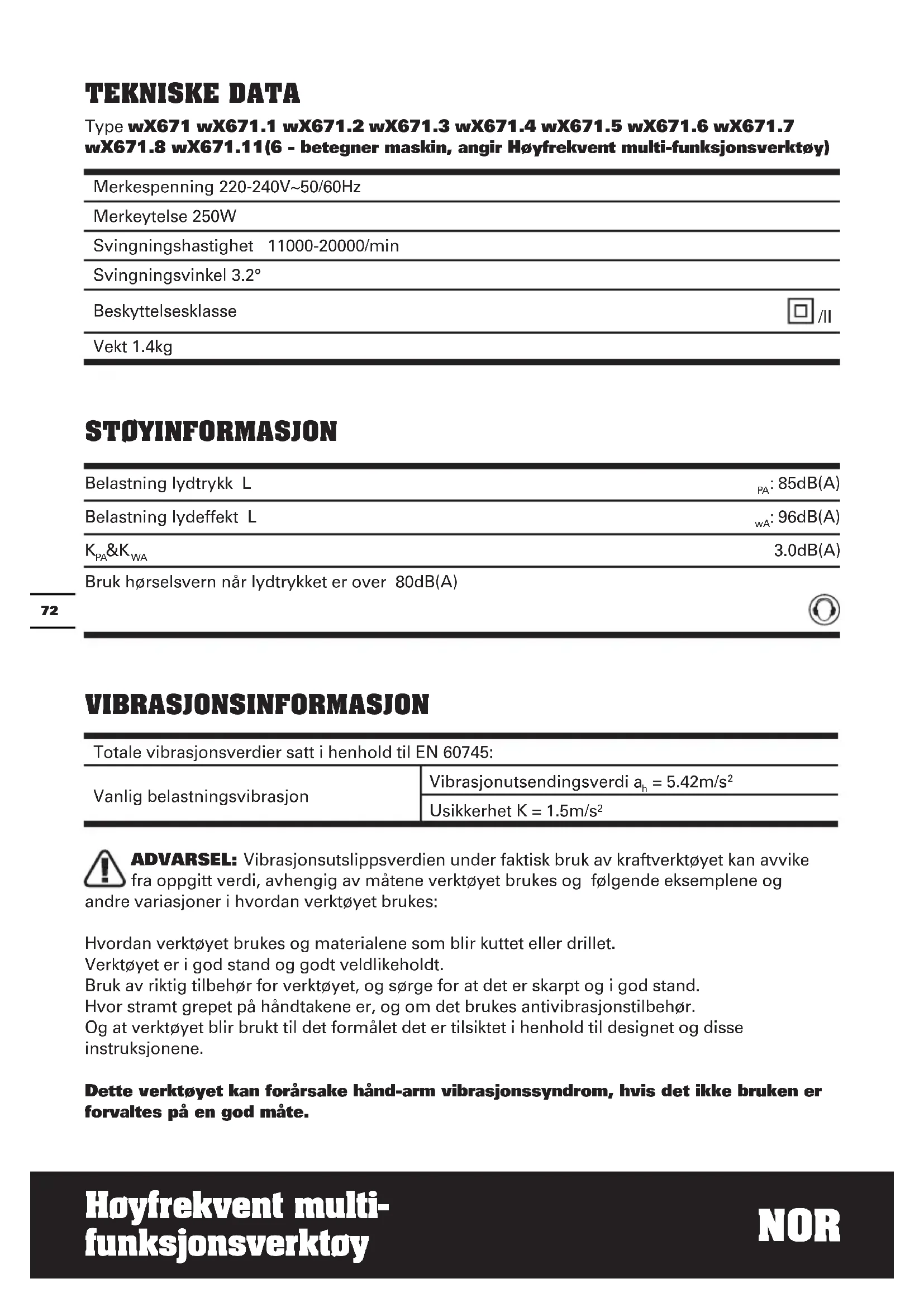 Usikkerhet K = 1.5m/s² ADVARSEL: Vibrasjonsutslippsverdien under faktisk bruk av kraftverktøyet kan avvike fra oppgitt verdi, avhengig av måtene verktøyet brukes og følgende eksemplene og andre variasjoner i hvordan verktøyet brukes: Hvordan verktøyet brukes og materialene som blir kuttet eller drillet. Verktøyet er i god stand og godt veldlikeholdt. Bruk av riktig tilbehør for verktøyet, og sørge for at det er skarpt og i god stand. Hvor stramt grepet på håndtakene er, og om det brukes antivibrasjonstilbehør. Og at verktøyet blir brukt til det formålet det er tilsiktet i henhold til designet og disse instruksjonene. Dette verktøyet kan forårsake hånd-arm vibrasjonssyndrom, hvis det ikke bruken er forvaltes på en god måte. Merkespenning 220-240V~50/60Hz Merkeytelse 250W Svingningshastighet 11000-20000/min Svingningsvinkel 3.2° Beskyttelsesklasse /II Vekt 1.4kg73 NOR Høyfrekvent multi- funksjonsverktøy ADVARSEL: For å være nøyaktig, bør også et overslag over eksponeringsnivå under faktiske bruksforhold også tas med i betraktning i alle deler av driftssyklusen, slik som når verktøyet er skrudd av og når det går på tomgang, men ikke faktisk gjør jobben. Dette kan redusere eksponeringsnivået betraktelig over hele arbeidsperioden. For å hjelpe til å minimere risikoen for vibrasjonseksponering. Bruk ALLTID skarpe meisler, driller og blad. Vedlikehold verktøyet i henhold til disse instruksjonene og sørg for at det er godt smurt (der det er hensiktsmessig). Hvis verktøyet skal brukes regelmessig, invester i antivibrasjonstilbehør. Unngå å bruke verktøy i temperaturer på 10