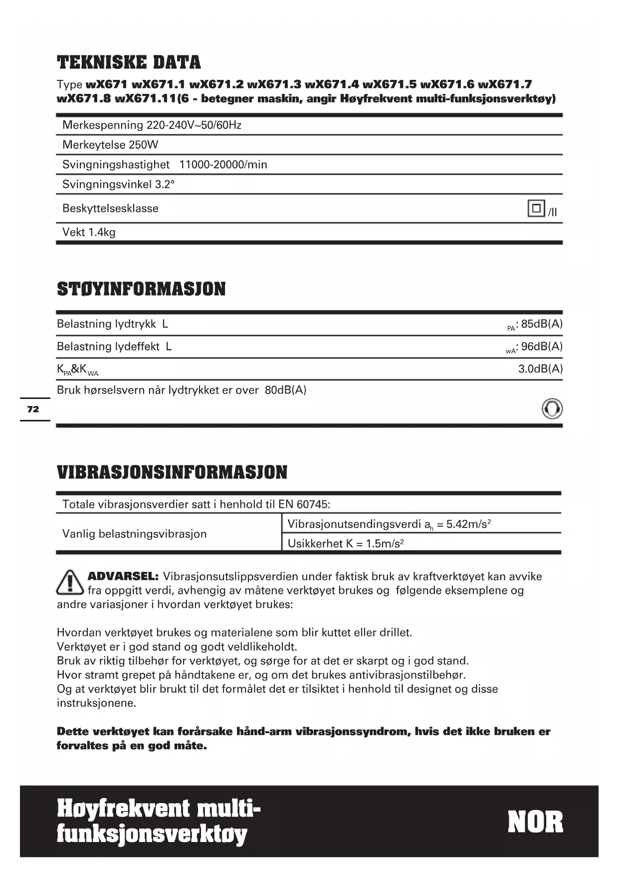 Usikkerhet K = 1.5m/s² ADVARSEL: Vibrasjonsutslippsverdien under faktisk bruk av kraftverktøyet kan avvike fra oppgitt verdi, avhengig av måtene verktøyet brukes og følgende eksemplene og andre variasjoner i hvordan verktøyet brukes: Hvordan verktøyet brukes og materialene som blir kuttet eller drillet. Verktøyet er i god stand og godt veldlikeholdt. Bruk av riktig tilbehør for verktøyet, og sørge for at det er skarpt og i god stand. Hvor stramt grepet på håndtakene er, og om det brukes antivibrasjonstilbehør. Og at verktøyet blir brukt til det formålet det er tilsiktet i henhold til designet og disse instruksjonene. Dette verktøyet kan forårsake hånd-arm vibrasjonssyndrom, hvis det ikke bruken er forvaltes på en god måte. Merkespenning 220-240V~50/60Hz Merkeytelse 250W Svingningshastighet 11000-20000/min Svingningsvinkel 3.2° Beskyttelsesklasse /II Vekt 1.4kg73 NOR Høyfrekvent multi- funksjonsverktøy ADVARSEL: For å være nøyaktig, bør også et overslag over eksponeringsnivå under faktiske bruksforhold også tas med i betraktning i alle deler av driftssyklusen, slik som når verktøyet er skrudd av og når det går på tomgang, men ikke faktisk gjør jobben. Dette kan redusere eksponeringsnivået betraktelig over hele arbeidsperioden. For å hjelpe til å minimere risikoen for vibrasjonseksponering. Bruk ALLTID skarpe meisler, driller og blad. Vedlikehold verktøyet i henhold til disse instruksjonene og sørg for at det er godt smurt (der det er hensiktsmessig). Hvis verktøyet skal brukes regelmessig, invester i antivibrasjonstilbehør. Unngå å bruke verktøy i temperaturer på 10
