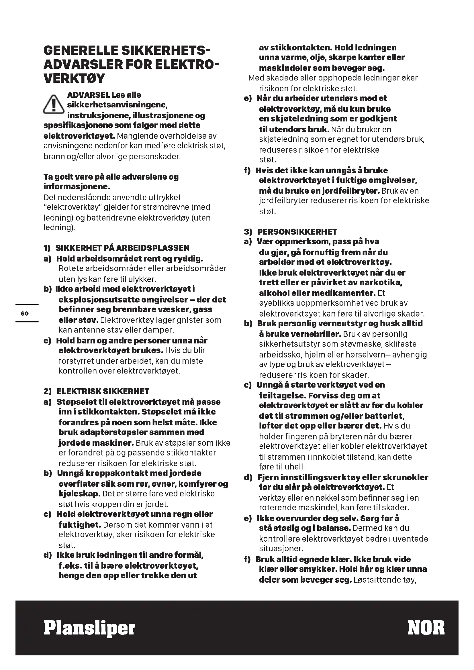 Usikkerhet K = 1.5m/s² Den oppgitte verdien for samlet vibrasjon kan brukes til å sammenligne verktøy og til å foreta en foreløpig vurdering av eksponering. ADVARSEL Vibrasjonsutslippsverdien under faktisk bruk av verktøyet kan avvike fra oppgitt verdi, avhengig av måten verktøyet brukes på og følgende eksempler og andre variasjoner i hvordan verktøyet brukes: Hvordan verktøyet brukes og hvilke materialene som blir kuttet eller drillet. Verktøyet er i god stand og godt veldlikeholdt. Bruk av riktig tilbehør for verktøyet, og sørge for at det er skarpt og i god stand. Hvor stramt grepet på håndtakene er, og om det brukes antivibrasjonstilbehør. Og at verktøyet blir brukt til det formålet det er tilsiktet i henhold til designet og disse instruksjonene. Dette verktøyet kan forårsake hånd-arm vibrasjonssyndrom, hvis det ikke brukes riktig. ADVARSEL For å være nøyaktig, bør også et overslag over eksponeringsnivå under faktiske bruksforhold også tas med i betraktning i alle deler av driftssyklusen, slik som når verktøyet er skrudd av og når det går på tomgang, men ikke faktisk gjør jobben. Dette kan redusere eksponeringsnivået betraktelig over hele arbeidsperioden. For å hjelpe til å minimere risikoen for vibrasjonseksponering. Plansliper NORPlansliper NOR