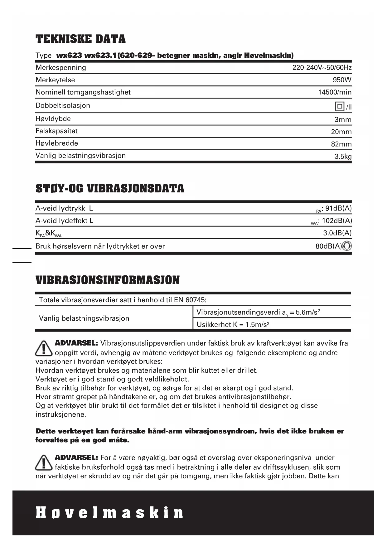 Erklærer at produitet, Beskrivelse WORX Høvelmaskin Type WX623 WX623.1(620-629-betegner maskin, angir Høvelmaskin) Funksjon Fjerne overflatemateriell med en roterende kutter