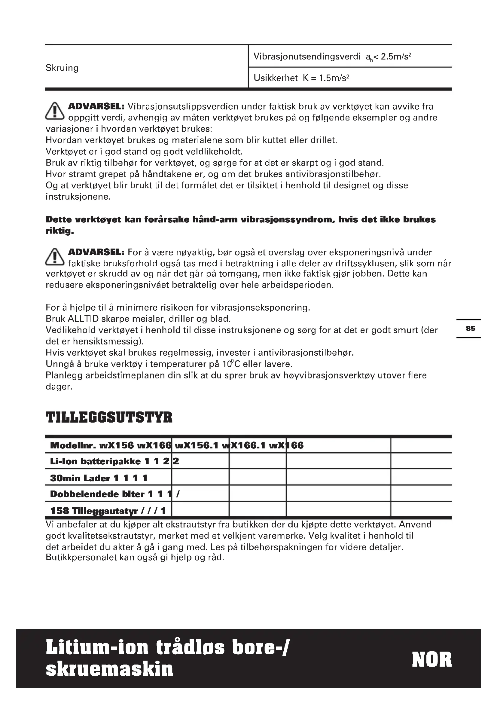 C eller lavere. Planlegg arbeidstimeplanen din slik at du sprer bruk av høyvibrasjonsverktøy utover flere dager. TILLEggSUTSTyR Vi anbefaler at du kjøper alt ekstrautstyr fra butikken der du kjøpte dette verktøyet. Anvend godt kvalitetsekstrautstyr, merket med et velkjent varemerke. Velg kvalitet i henhold til det arbeidet du akter å gå i gang med. Les på tilbehørspakningen for videre detaljer. Butikkpersonalet kan også gi hjelp og råd. Modellnr. wX156 wX166 wX156.1 wX166.1 wX166 Li-Ion batteripakke 1 1 2 2 30min Lader 1 1 1 1 Dobbelendede biter 1 1 1 / 158 Tilleggsutstyr / / / 186 Litium-ion trådløs bore-/ skruemaskin NOR EKSTRA SIKKERHETSREGLER FOR