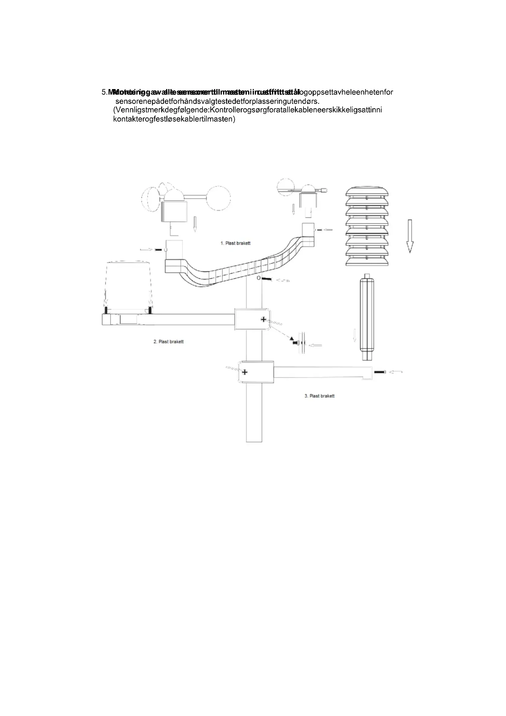 logoppsettavheleenhetenfor sensorenepådetforhåndsvalgtestedetforplasseringutendørs. (Vennligstmerkdegfølgende:Kontrollerogsørgforatallekableneerskikkeligsattinni kontakterogfestløsekablertilmasten)LCD LCD LCD LCDoversikt oversikt oversikt oversikt 1.Lavtbatteriinnendørsenhet 2.Lavtbatteriutendørsenhet 3.Trendutendørsluftfuktighet 4.Luftfuktighetutendørs 5.ikkeaktividenneenheten 6.Temperaturutendørs 7.Trendutendørstemperatur 8.RFsensorsymbol 9.Alarmfortemperaturutendørs 10.Alarmfortemperaturinnendørs 11.Temperaturinnendørs 12.Trendinnendørstemperatur 13.Luftfuktighetinnendørs 14.Trendinnendørsluftfuktighet 15.Lufttrykk 16.Værmelding 17.Regnmengde 18.Vindhastighet 19.Vindretning 20.Sommertid 21.RCCsymbol(DCF77tidssignal) 22.Dato 23.Tid 24.Måned 25.Dagiuken 26.Dobbelalarm 27.MånefaseInnledende Innledende Innledende Innledendedrift drift drift driftav
