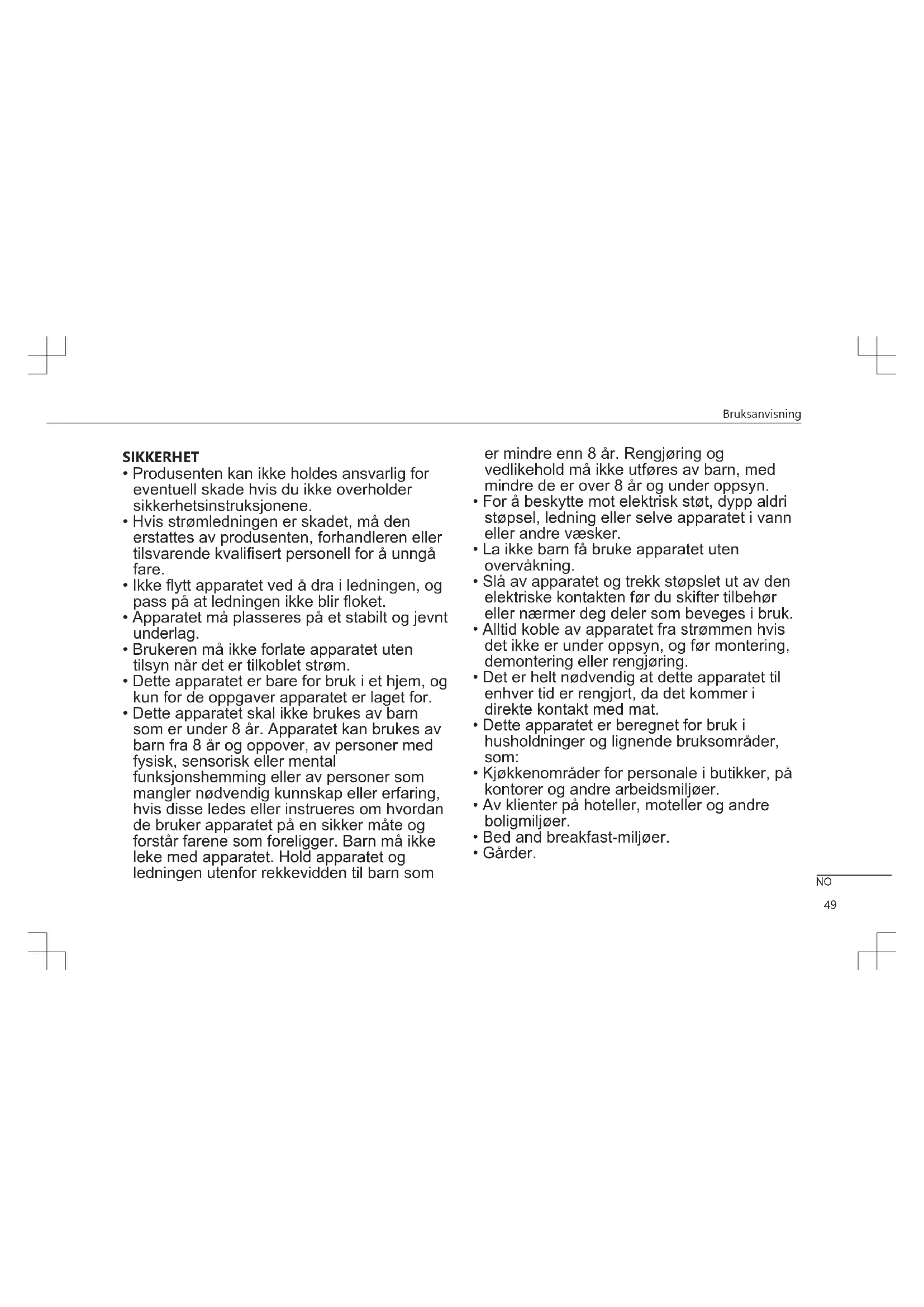 - Dette apparatet skal ikke brukes av barn som er under 8 år. Apparatet kan brukes av barn fra 8 år og oppover, av personer med fysisk, sensorisk eller mental funksjonshemming eller av personer som mangler nødvendig kunnskap eller erfaring, hvis disse ledes eller instrueres om hvordan de bruker apparatet på en sikker måte og forstår farene som foreligger. Barn må ikke leke med apparatet. Hold apparatet og ledningen utenfor rekkevidden til barn som er mindre enn 8 år. Rengjøring og vedlikehold må ikke utføres av barn, med mindre de er over 8 år og under oppsyn.
