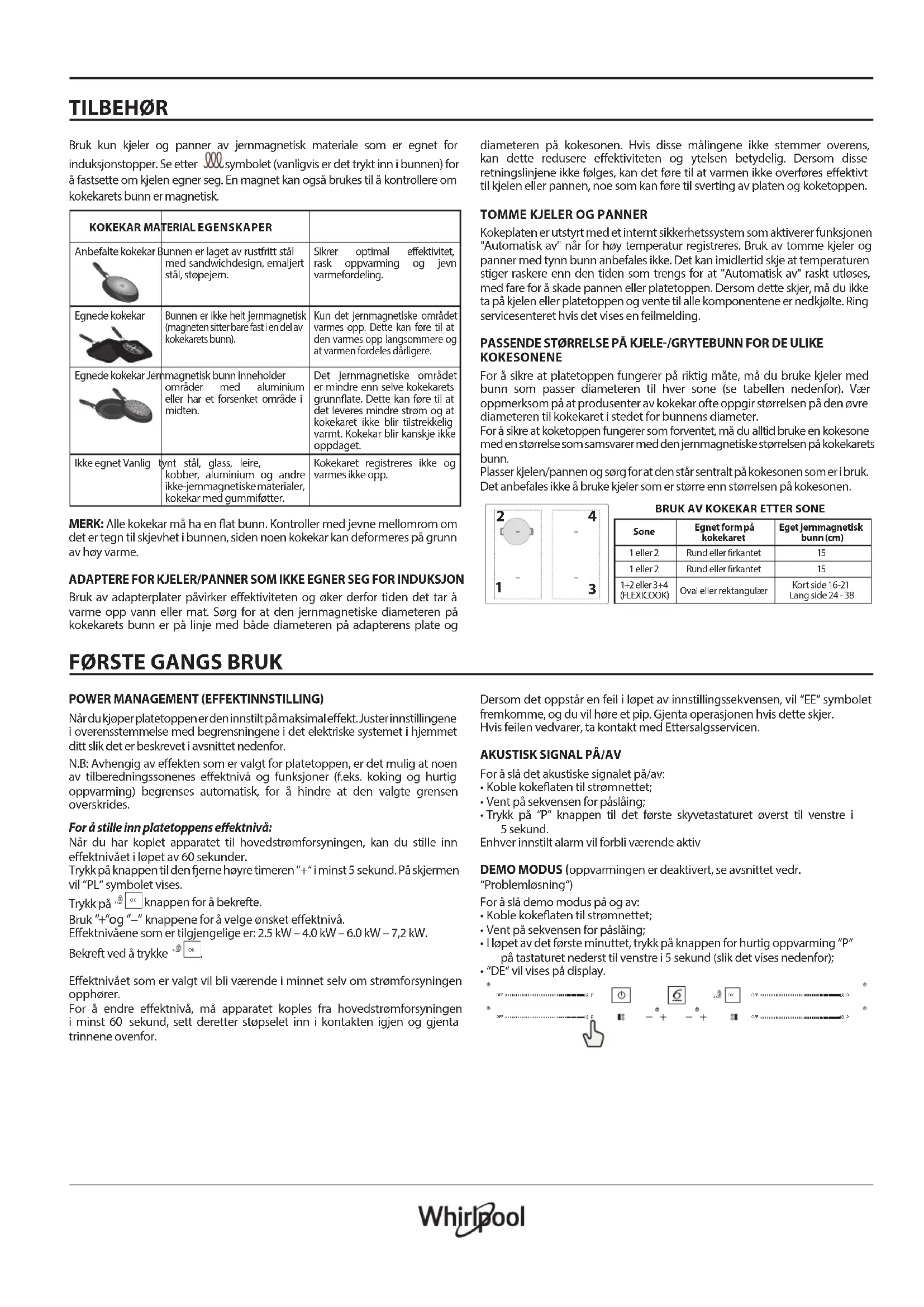 Platetoppen tillater ikke at en spesialfunksjon aktiveres. Eektregulatoren begrenser eektnivåene i henhold til den maksimale verdien som er stilt inn for platetoppen. Se avsnittet ”Eektinnstilling”. f.eks. [Eektnivået er lavere enn nivået som ønskes] Platetoppen stiller automatisk inn et minste eektnivå for å sikre at tilberedningssonen kan benyttes. Eektregulatoren begrenser eektnivåene i henhold til den maksimale verdien som er stilt inn for platetoppen. Se avsnittet ”Eektinnstilling”. Induksjonstoppene kan knitre eller knirke ved normal drift. Disse lydene har sin opprinnelse i kokeredskapen og er knyttet til egenskapene til kjelenes bunn (for eksempel, når bunnene er laget av forskjellige lag med material eller når de ikke er jevne). Disse lydene kan variere avhengig av hvilken type redskap som benyttes og hvor mye mat de inneholder og de er ikke tegn på at noe er feil.