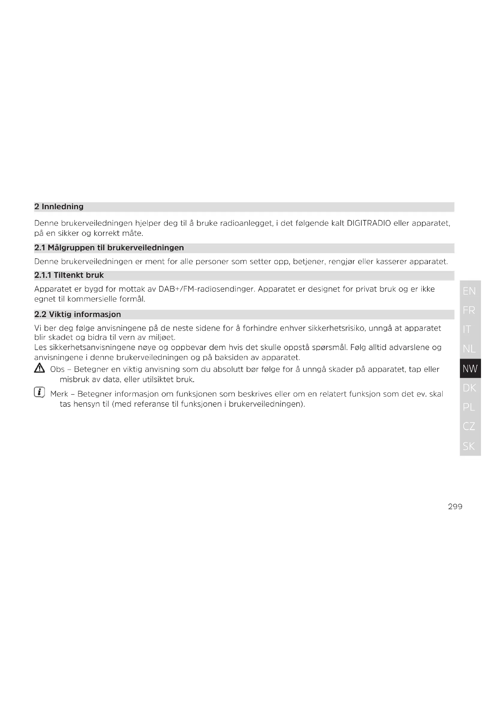 2 Innledning Denne brukerveiledningen hjelper deg til å bruke radioanlegget, i det følgende kalt DIGITRADIO eller apparatet, på en sikker og korrekt måte.