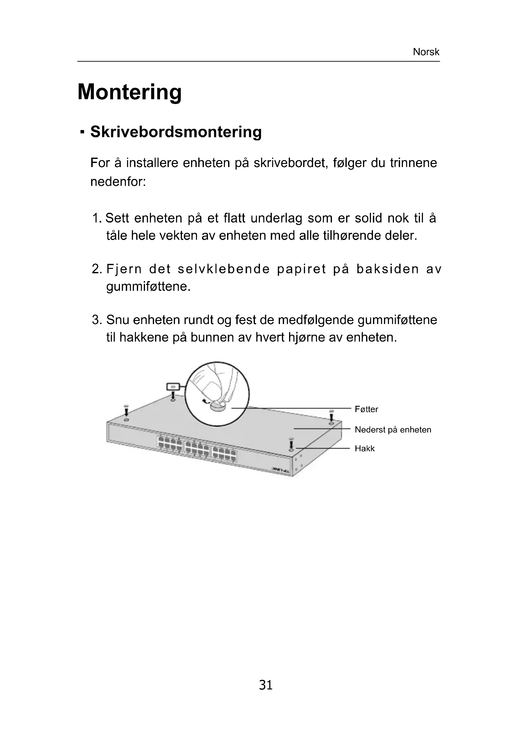 Skrivebordsmontering For å installere enheten på skrivebordet, følger du trinnene nedenfor: