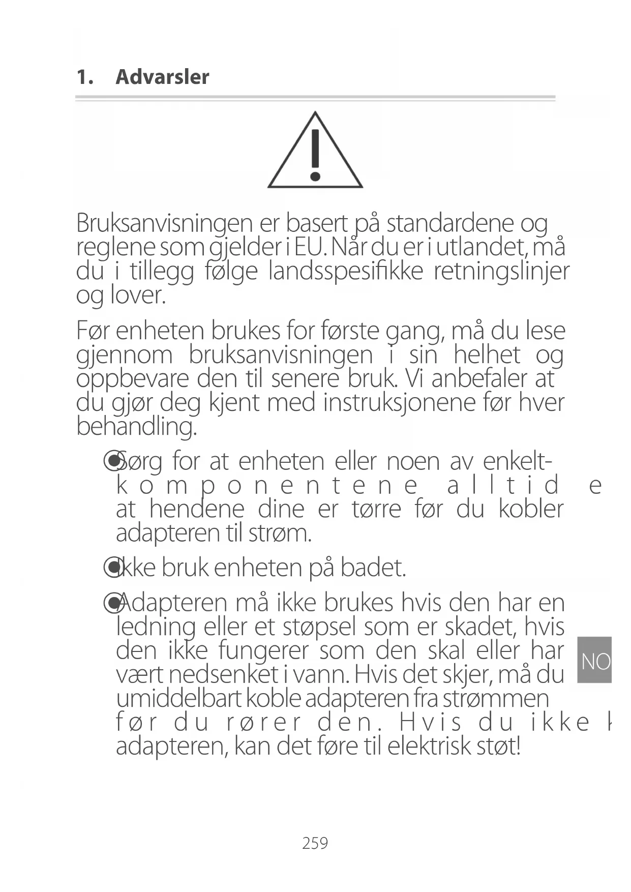 Adapteren må ikke brukes hvis den har en ledning eller et støpsel som er skadet, hvis den ikke fungerer som den skal eller har vært nedsenkétivann. Hvis det skjer, mA du umiddelbart koble adaptereren fra strømmen før du rører den. Hvis du ikke adaptoreren, kan det fore til elektrisk/Stt!