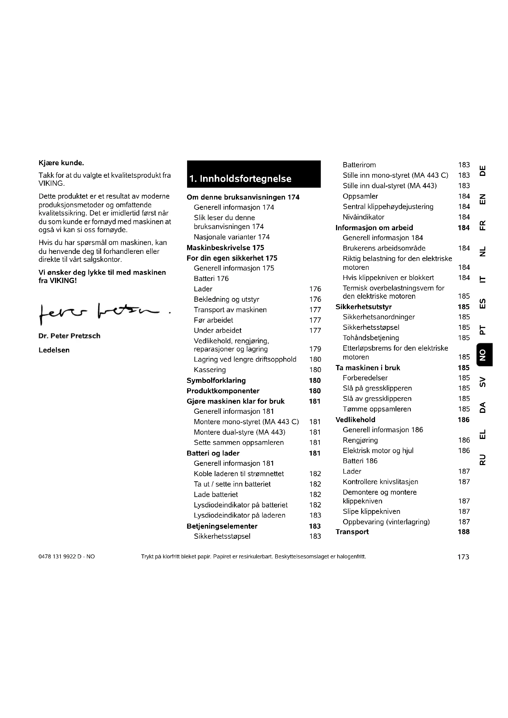 Om denne bruksanvisningen 174 Generell informasjon 174 Slik leser du denne bruksanvisningen 174 Nasjonale varianter 174 Maskinbeskrivelse 175 For din egen sikkerhet 175 Generell informasjon 175 Batteri 176 Lader 176 Bekledning og utstyr 176 Transport av maskinen 177 Før arbeidet 177 Under arbeidet 177 Vedlikehold, rengjøring, reparasjoner og lagring 179 Lagring ved lengre driftsopphold 180 Kassering 180 Symbolforklaring 180 Produktkomponenter 180 Gjøre maskinen klar for bruk 181 Generell informasjon 181 Montere mono-styret (MA 443 C) 181 Montere dual-styre (MA 443) 181 Sette sammen oppsamleren 181 Batteri og lader 181 Generell informasjon 181 Koble laderen til strømnettet 182 Ta ut / sette inn batteriet 182 Lade batteriet 182 Lysdiodeindikator på batteriet 182 Lysdiodeindikator på laderen 183 Betjeningselementer 183 Sikkerhetsstøpsel 183 Batterirom 183 Stille inn mono-styret (MA 443 C) 183 Stille inn dual-styret (MA 443) 183 Oppsamler 184 Sentral klippehøydejustering 184 Nivåindikator 184 Informasjon om arbeid 184 Generell informasjon 184 Brukerens arbeidsområde 184 Riktig belastning for den elektriske motoren 184 Hvis klippekniven er blokkert 184 Termisk overbelastningsvern for den elektriske motoren 185 Sikkerhetsutstyr 185 Sikkerhetsanordninger 185 Sikkerhetsstøpsel 185 Tohåndsbetjening 185 Etterløpsbrems for den elektriske motoren 185 Ta maskinen i bruk 185 Forberedelser 185 Slå på gressklipperen 185 Slå av gressklipperen 185 Tømme oppsamleren 185 Vedlikehold 186 Generell informasjon 186 Rengjøring 186 Elektrisk motor og hjul 186 Batteri 186 Lader 187 Kontrollere knivslitasjen 187 Demontere og montere klippekniven 187 Slipe klippekniven 187 Oppbevaring (vinterlagring) 187 Transport 1880478 131 9922 D - NO