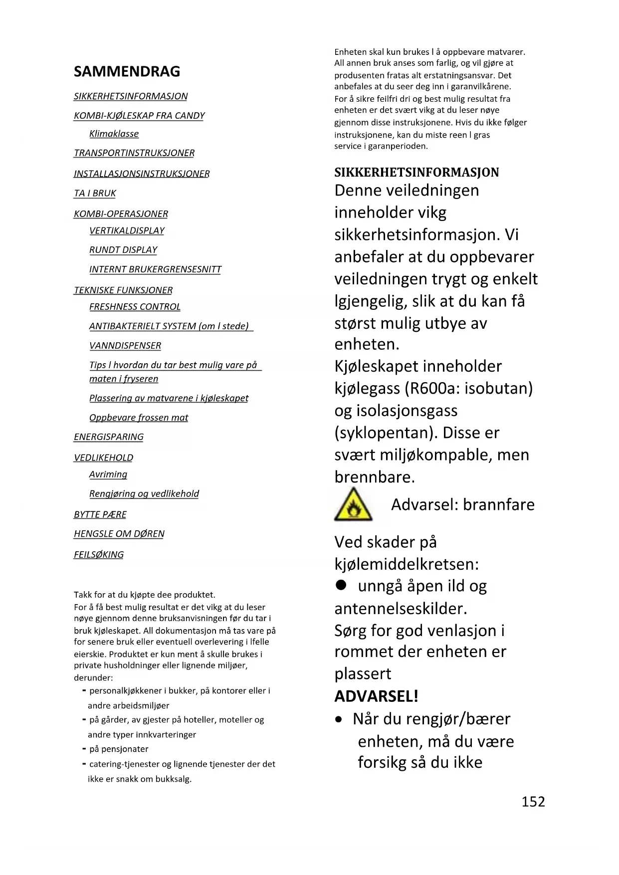 Takk for at du kjøpte dette produktet. For å få best mulig resultat er det viktig at du leser nøye gjennom denne bruksanvisningen før du tar i bruk kjøleskapet. All dokumentasjon må tas vare på for senere bruk eller eventuell overlevering i tilfelle eierskifte. Produktet er kun ment å skulle brukes i private husholdninger eller lignende miljøer, derunder: - personalkjøkkener i butikker, på kontorer eller i andre arbeidsmiljøer - på gårder, av gjester på hoteller, moteller og andre typer innkvarteringer - på pensjonater - catering-tjenester og lignende tjenester der det ikke er snakk om butikksalg. Enheten skal kun brukes til å oppbevare matvarer. All annen bruk anses som farlig, og vil gjøre at produsenten fratas alt erstatningsansvar. Det anbefales at du setter deg inn i garantivilkårene. For å sikre feilfri drift og best mulig resultat fra enheten er det svært viktig at du leser nøye gjennom disse instruksjonene. Hvis du ikke følger instruksjonene, kan du miste retten til gratis service i garantiperioden. SIKKERHETSINFORMASJON Denne veiledningen inneholder viktig sikkerhetsinformasjon. Vi anbefaler at du oppbevarer veiledningen trygt og enkelt tilgjengelig, slik at du kan få størst mulig utbytte av enheten. Kjøleskapet inneholder kjølegass (R600a: isobutan) og isolasjonsgass (syklopentan). Disse er svært miljøkompatible, men brennbare.